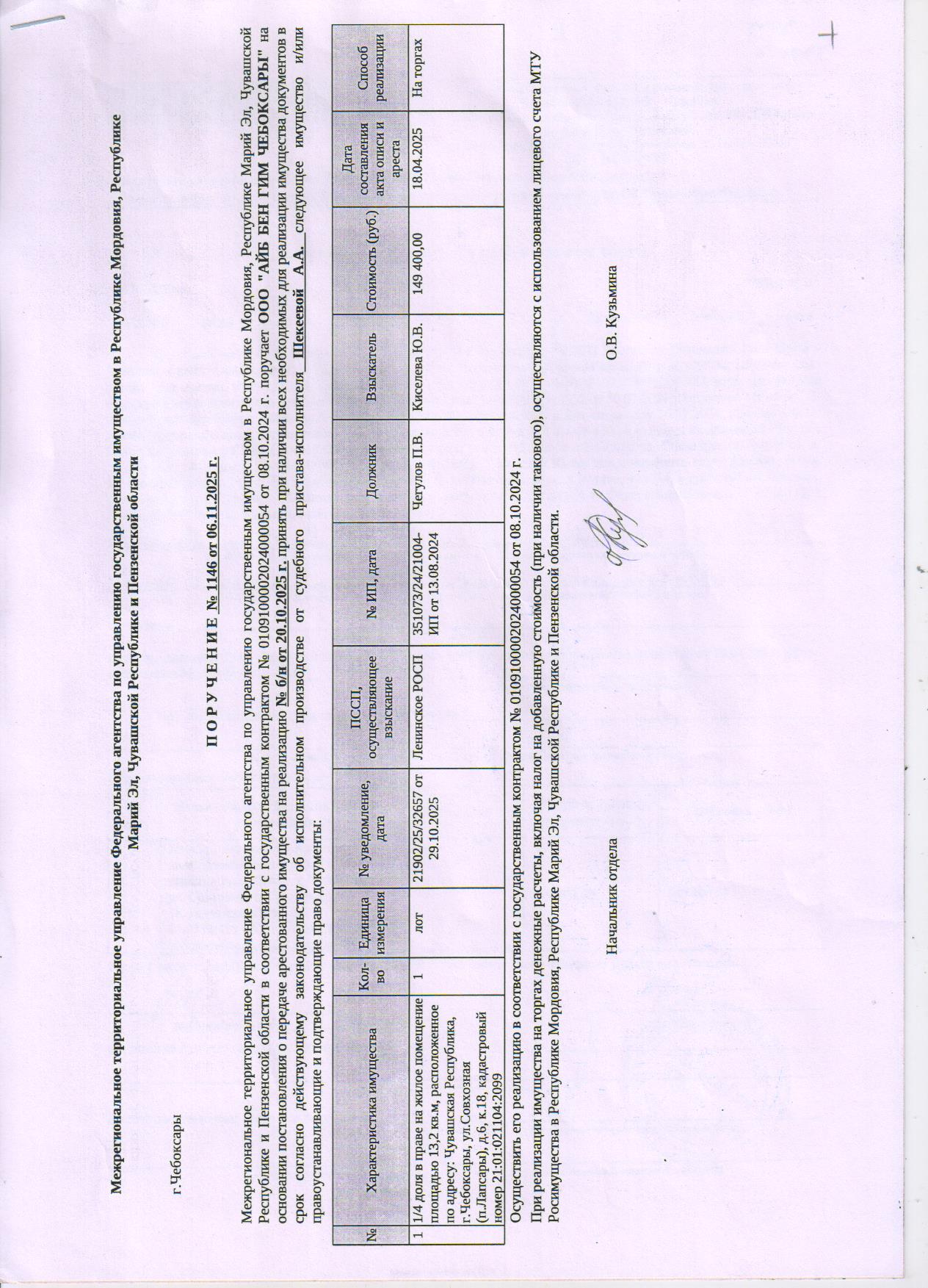 1/4 доля в праве на жилое помещение, площадью 13,2 кв. м, расположенное по адресу: Чувашская Республика, г. Чебоксары, ул. Совхозная (п. Лапсары), д. 6, к. 18, кадастровый №21:01:021104:2099