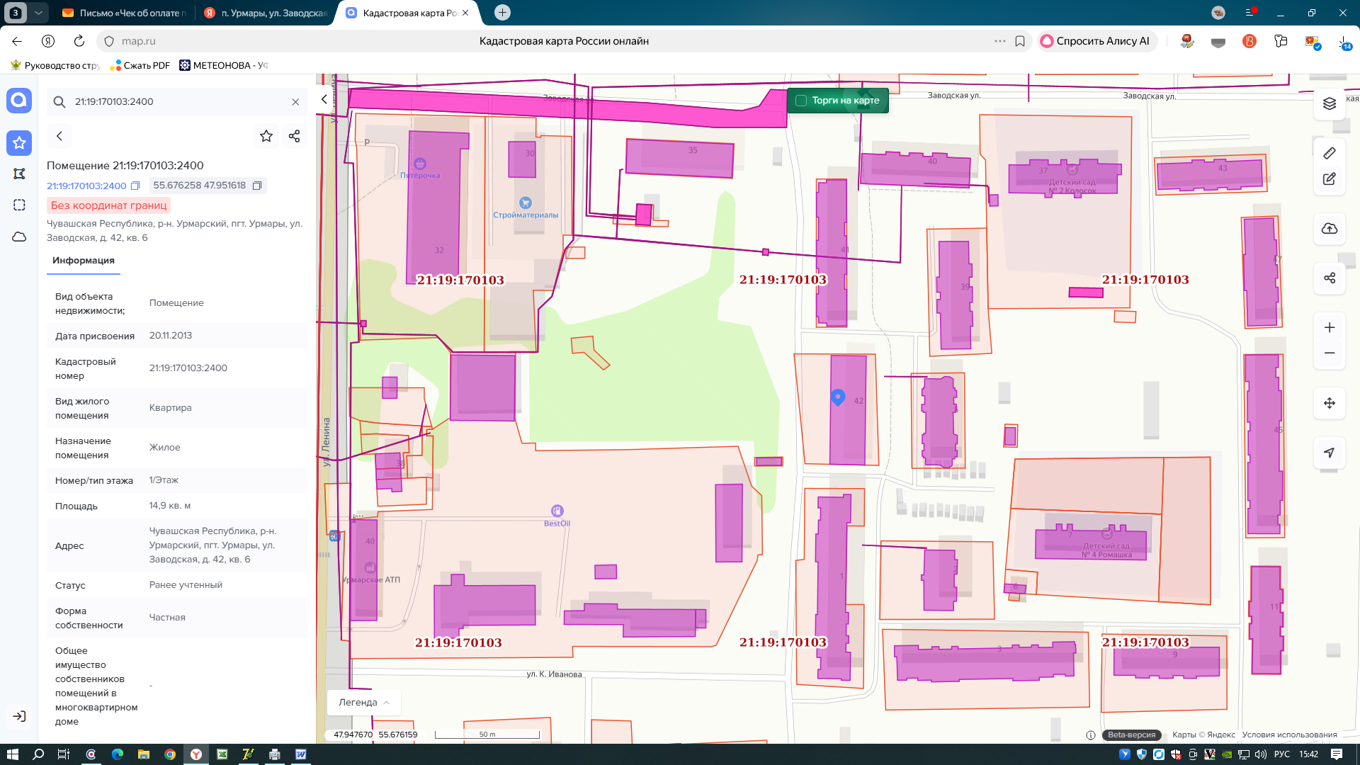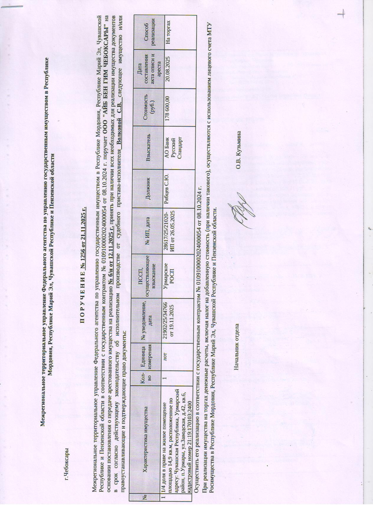 1/4 доля в праве на жилое помещение, площадью 14,9 кв. м, расположенное по адресу: Чувашская Республика, Урмарский район, п. Урмары, ул. Заводская, д. 42, кв. 6, кадастровый №21:19:170103:2400