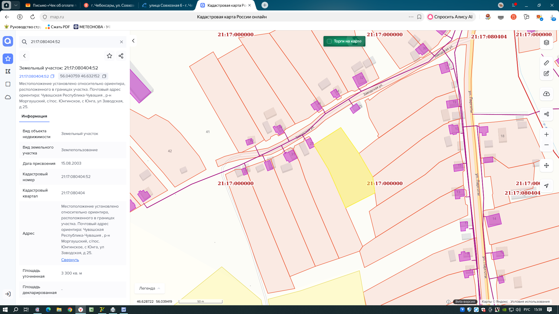 Земельный участок для ведения личного подсобного хозяйства, площадью 3300 кв. м, расположенный по адресу: Чувашская Республика, Моргаушский район, с. Юнга, ул. Заводская, д. 25, кадастровый №21:17:080404:52