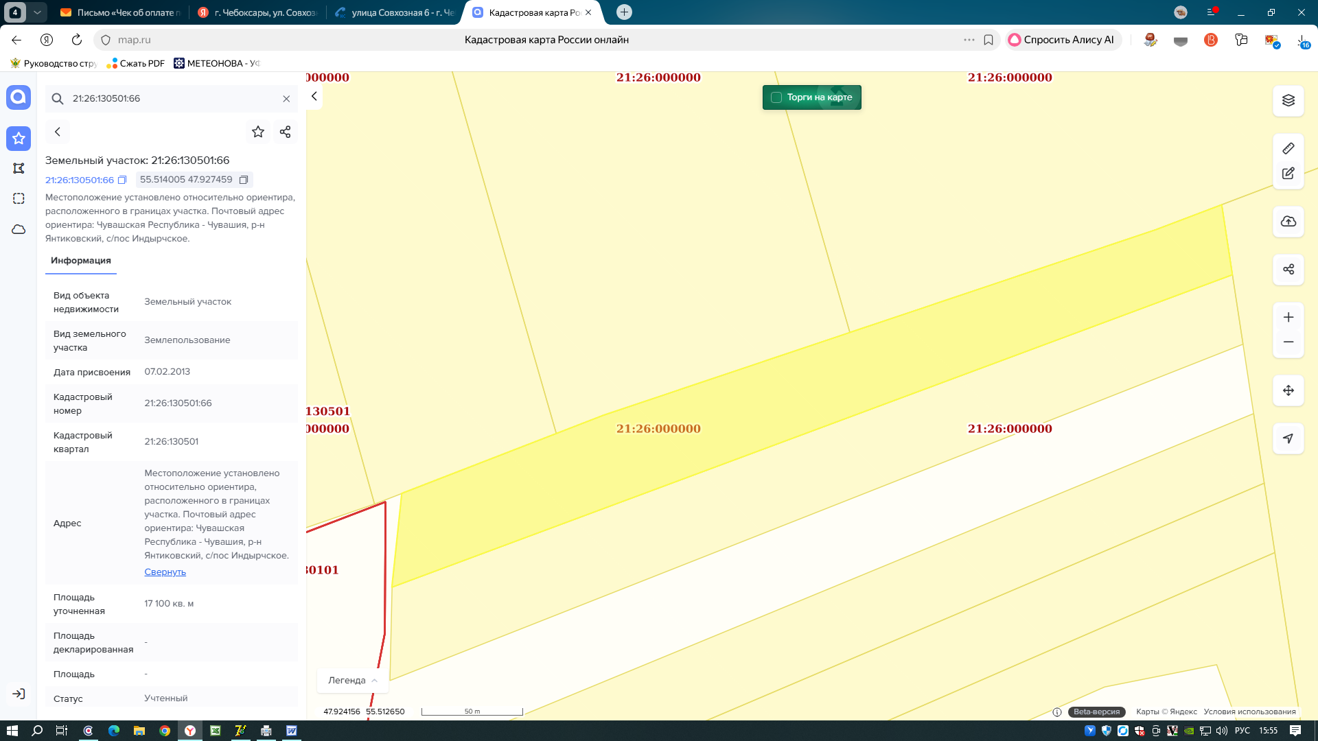 Земельный участок для ведения сельскохозяйственного производства, площадью 17100 кв. м, расположенный по адресу: Чувашская Республика, Янтиковский район, с/пос. Индырчское, кадастровый №21:26:130501:66