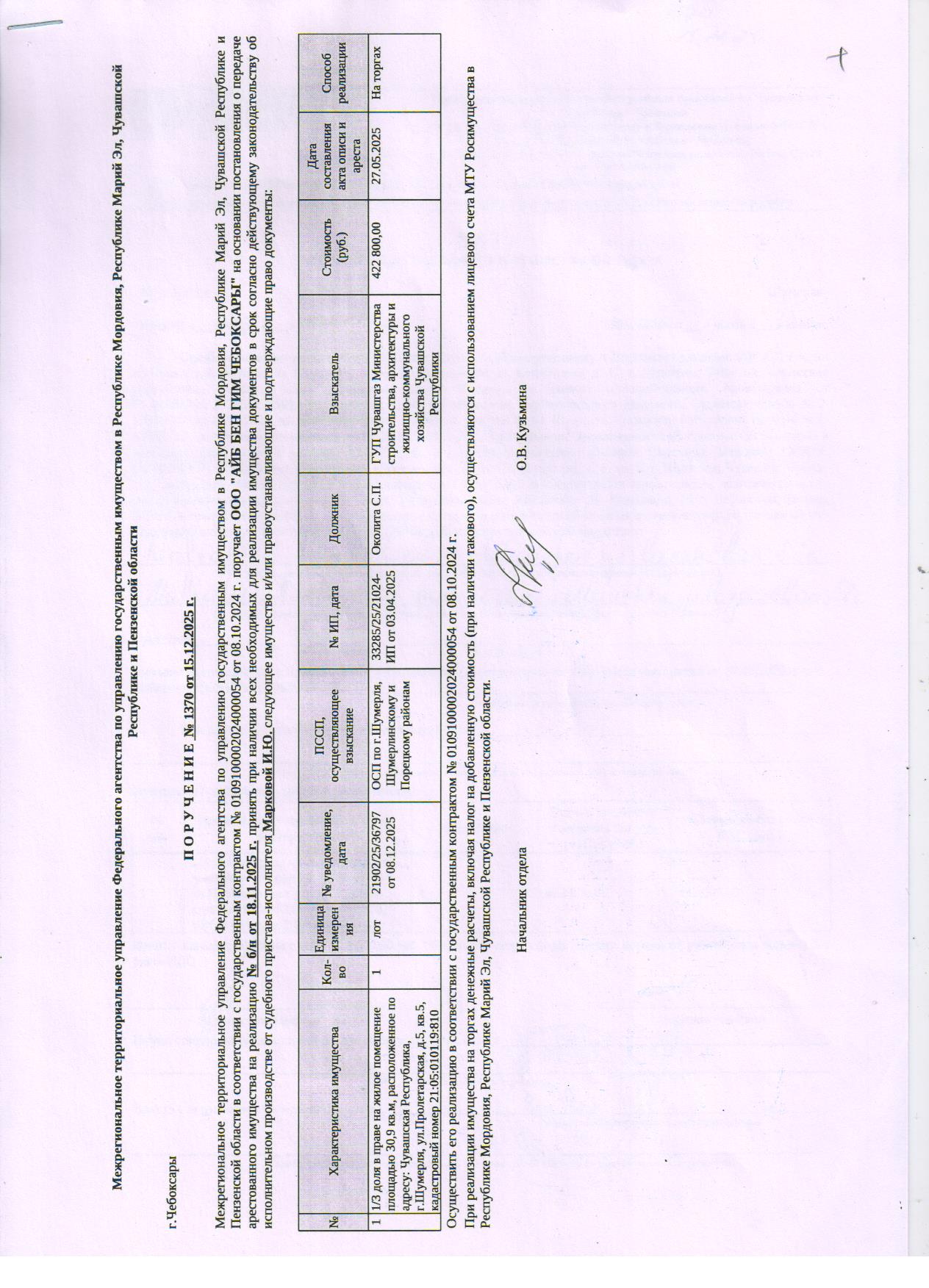 1/3 доля в праве на жилое помещение, площадью 30,9 кв. м, расположенное по адресу: Чувашская Республика, г. Шумерля, ул. Пролетарская, д. 5, кв. 5, кадастровый №21:05:010119:810