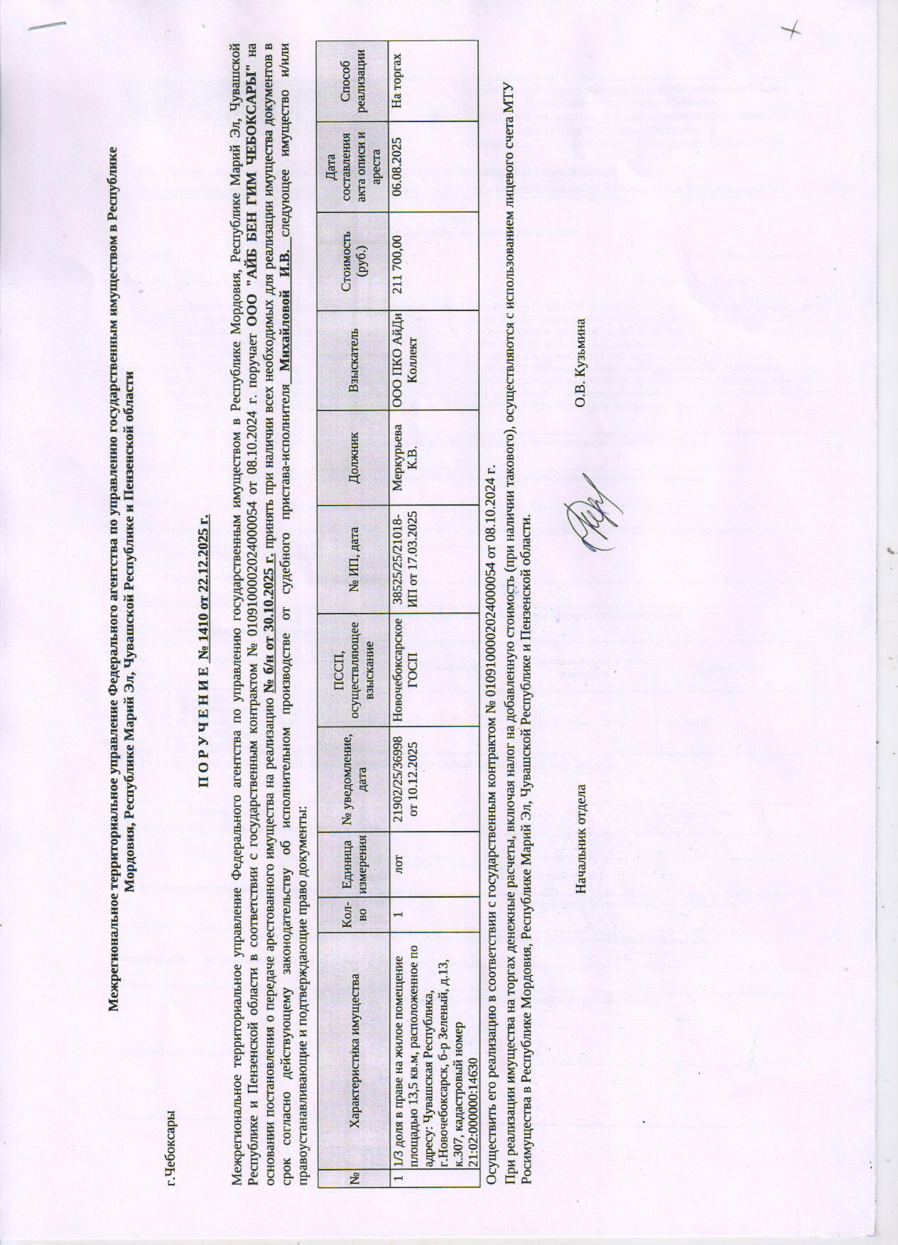 1/3 доля в праве на жилое помещение, площадью 13,5 кв. м, расположенное по адресу: Чувашская Республика, г. Новочебоксарск, б-р Зеленый, д. 13, к. 307, кадастровый №21:02:000000:14630