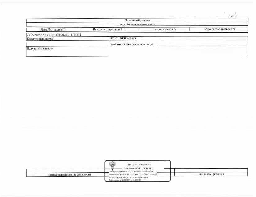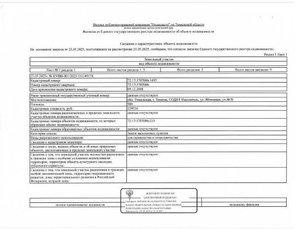 Земельный участок, площадь 900 кв.м., кадастровый номер: 72:17:1707006:1495, г. Тюмень, СОДНТ Изыскатель, ул. Яблоневая, уч.№70, рег.№ 72-010567-ГМУ_ХМАО;