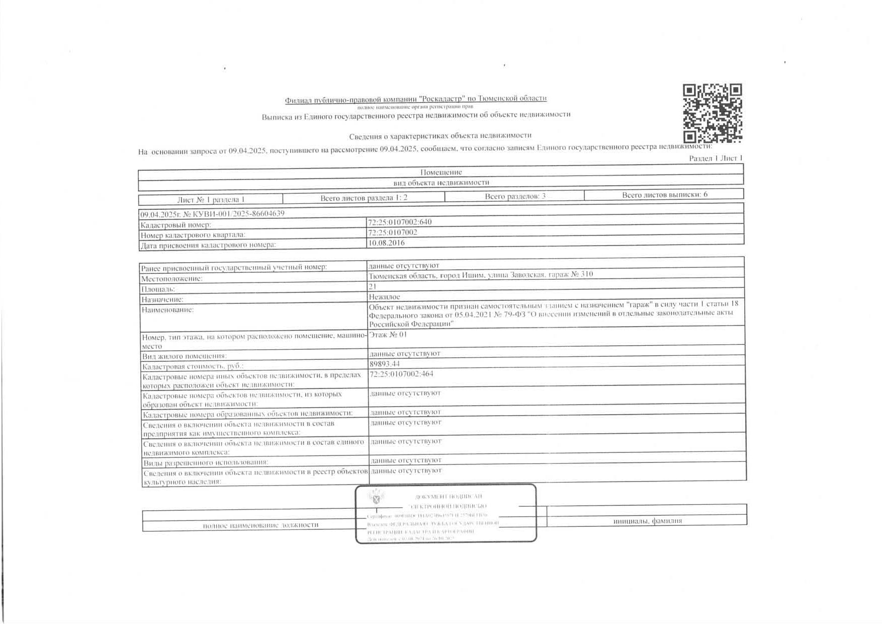 Нежилое помещение (гараж), площадь 21 кв. м., кадастровый номер: 72:25:0107002:640, г. Ишим, ул. Заводская, гараж №310, рег.№ 72-010459;