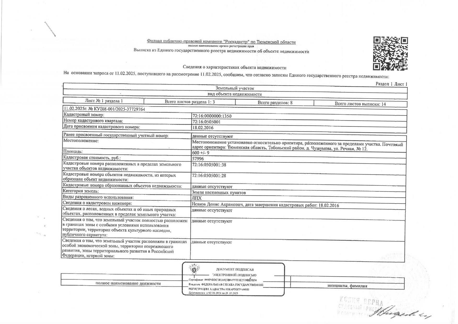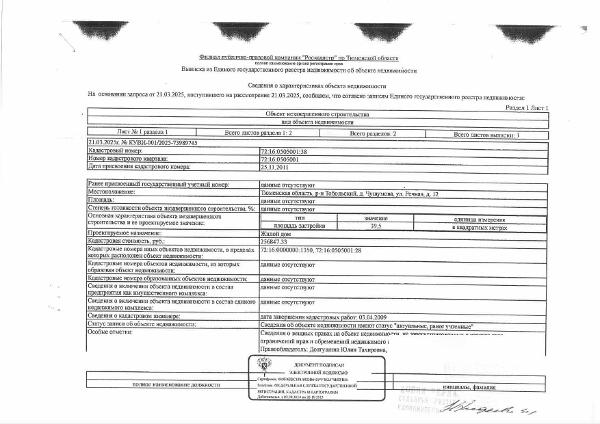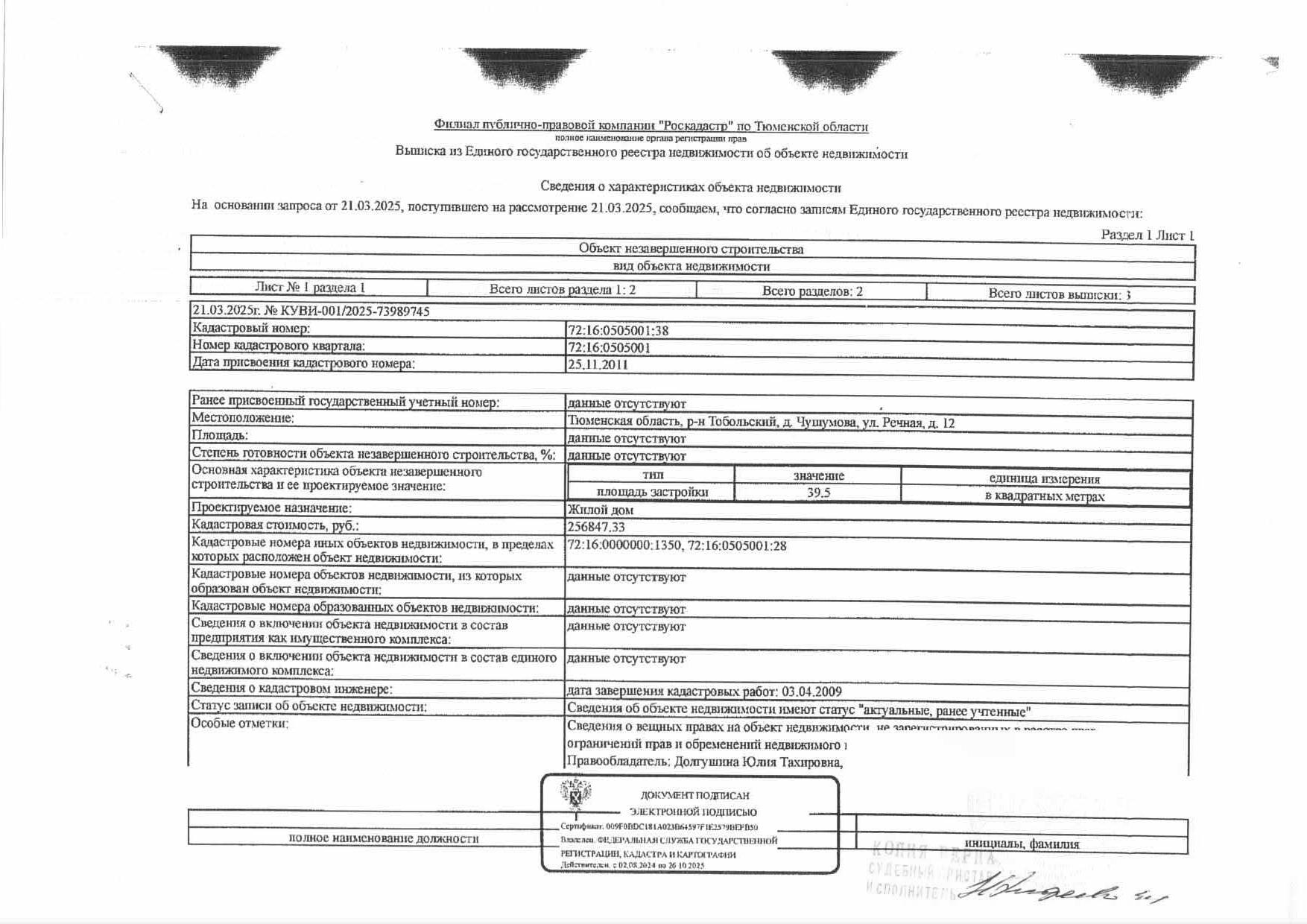 Земельный участок, площадь 600 кв.м., кадастровый номер: 72:16:0000000:1350, объект незавершенного строительства (жилой дом), площадь 39,5 кв.м., кадастровый номер:72:16:0505001:38, Тобольский район, д. Чушумова, ул. Речная, 12, рег.№ 72-0105-14;