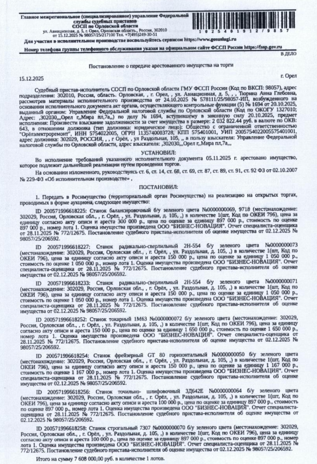 Станок точильно-шлифовочный 3Д642Е №0000000064 б/у зеленого цвета. Место хранения: г. Орел, ул. Раздольная, д.105. Ответственный хранитель Адьятулин С.М. Взыскатель: УФНС по Орловской области. Начальная цена 897 000 (Восемьсот девяносто семь тысяч) руб. 00 коп., без НДС, сумма задатка 440 000 (Четыреста сорок тысяч) руб. 00 коп. Шаг аукциона 1%: 8 970 (Восемь тысяч девятьсот семьдесят) руб. 00 коп.