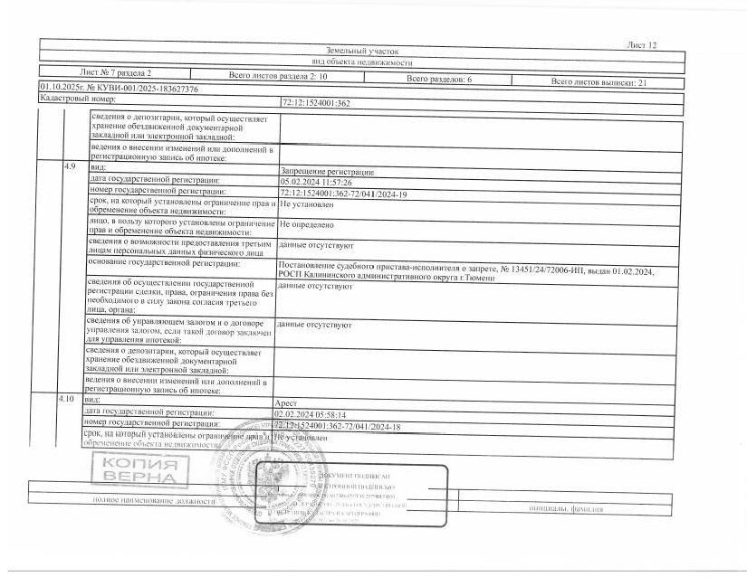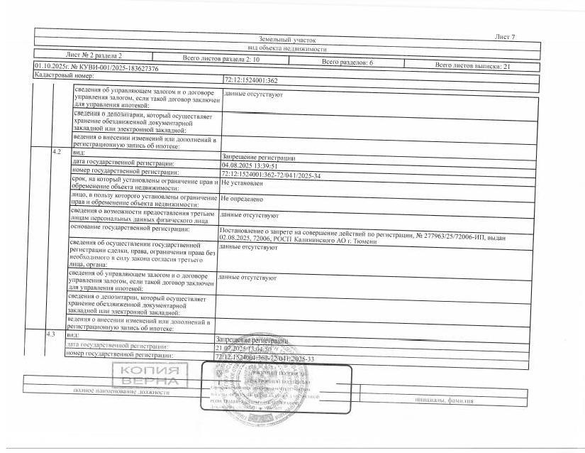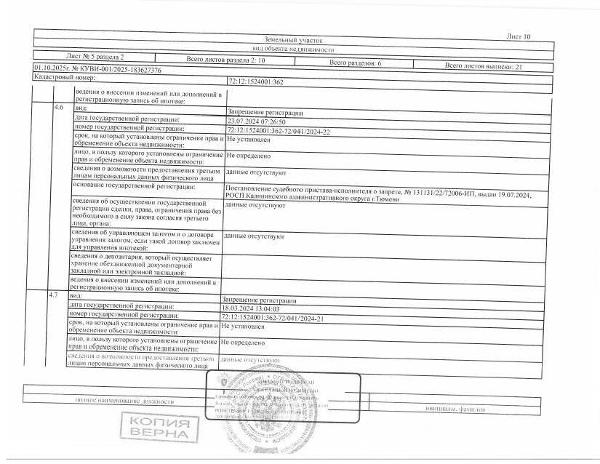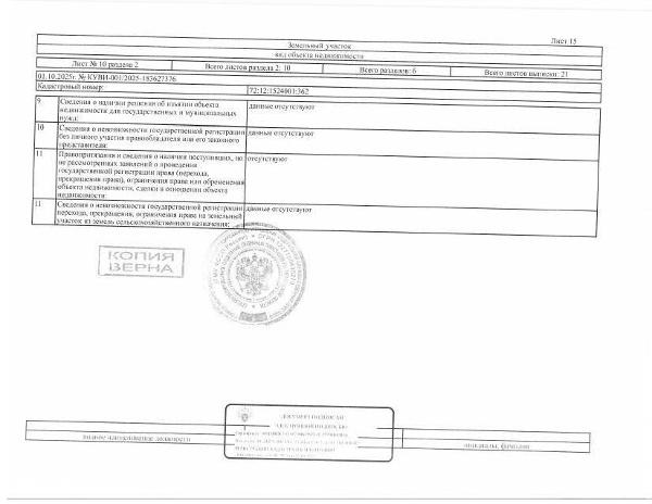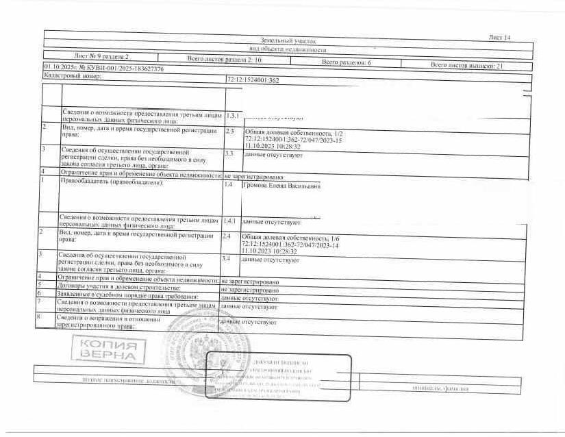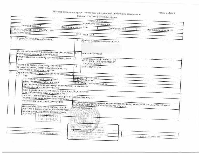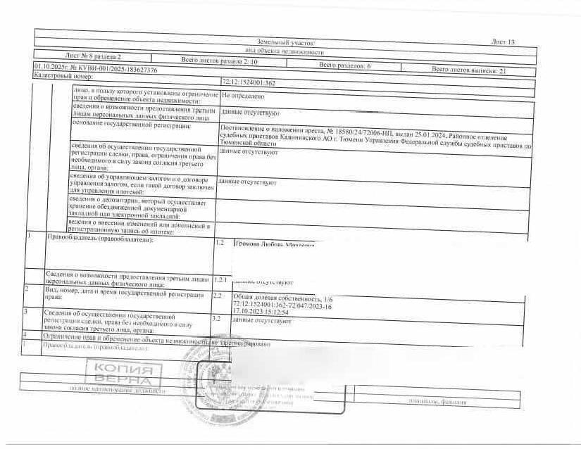 Должник: Громова А.А. собственник: Громова А.А., Громова Л.М., Громова Е.В. Лот: 1/6 земельного участка (земли сельхозхозяйственного назначения, для садоводства и огородничества), площадь 954 кв.м., кадастровый номер: 72:12:1524001:362, Нижнетавдинский р-н., СНТ «Фортуна», ул. 14, участок № 614, (сделка подлежит нотариальному удостоверению), н/ц: 58480 р., з-к: 8772 р., рег.№ 72-0105-03-ГМУ;