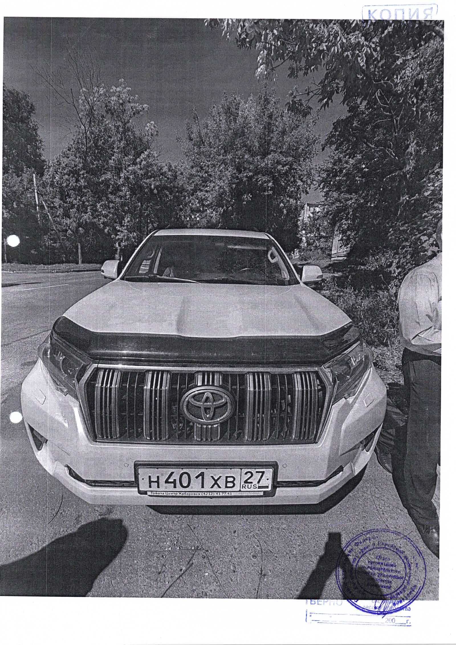 Легковой автомобиль Toyota Land Cruiser Prado, 2017 года выпуска, номер шасси JTEBR3FJ50K076426, идентификационный номер (VIN) JTEBR3FJ50K076426, государственный номер H401XB27. Регистрационный номер 777/А. Собственник – ООО «Агромясторг». Начальная цена – 1800500 руб. (НДС не облагается). Задаток – 450125 руб. Шаг аукциона – 18005 руб. (ОСП по Хабаровскому району – 89249265018 Степко С.Н.)