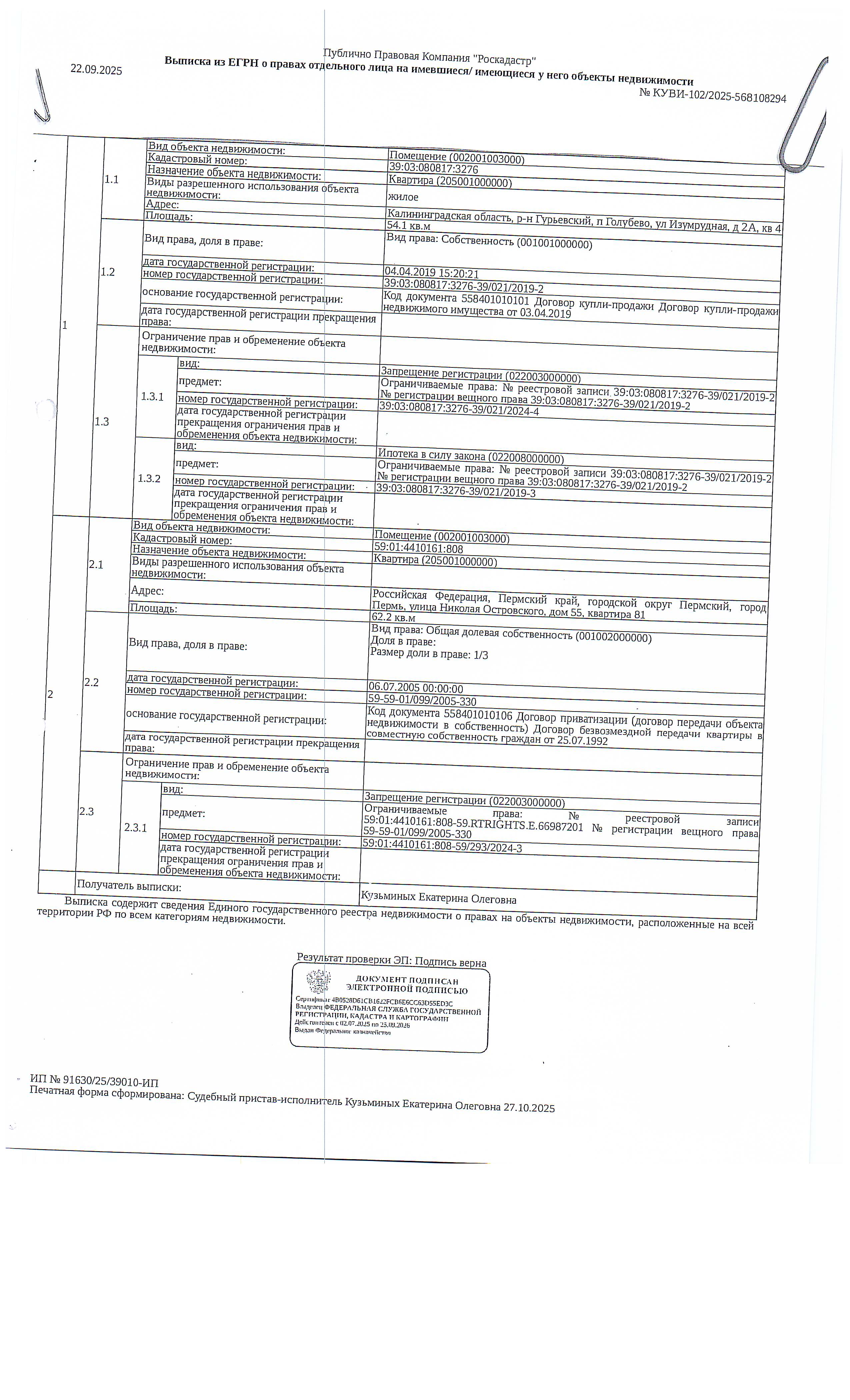 Квартира общей площадью 54,1 кв. м, кадастровый номер 39:03:080817:3276