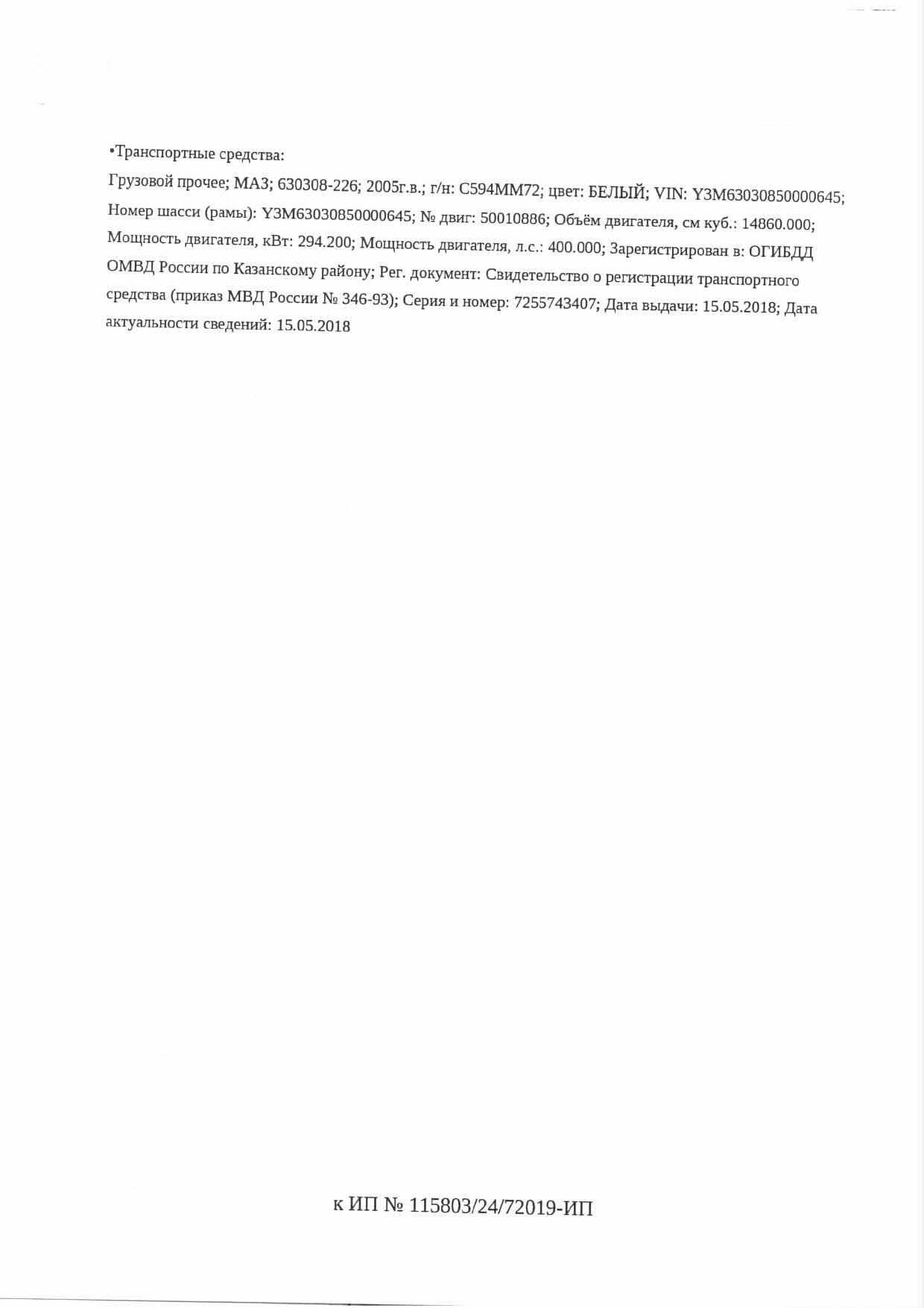 Транспортное средство, грузовой МАЗ 630308-226, 2005 г.в., г/н С594ММ72, VIN: Y3M63030850000645, рег.№ 72-010437-2;
