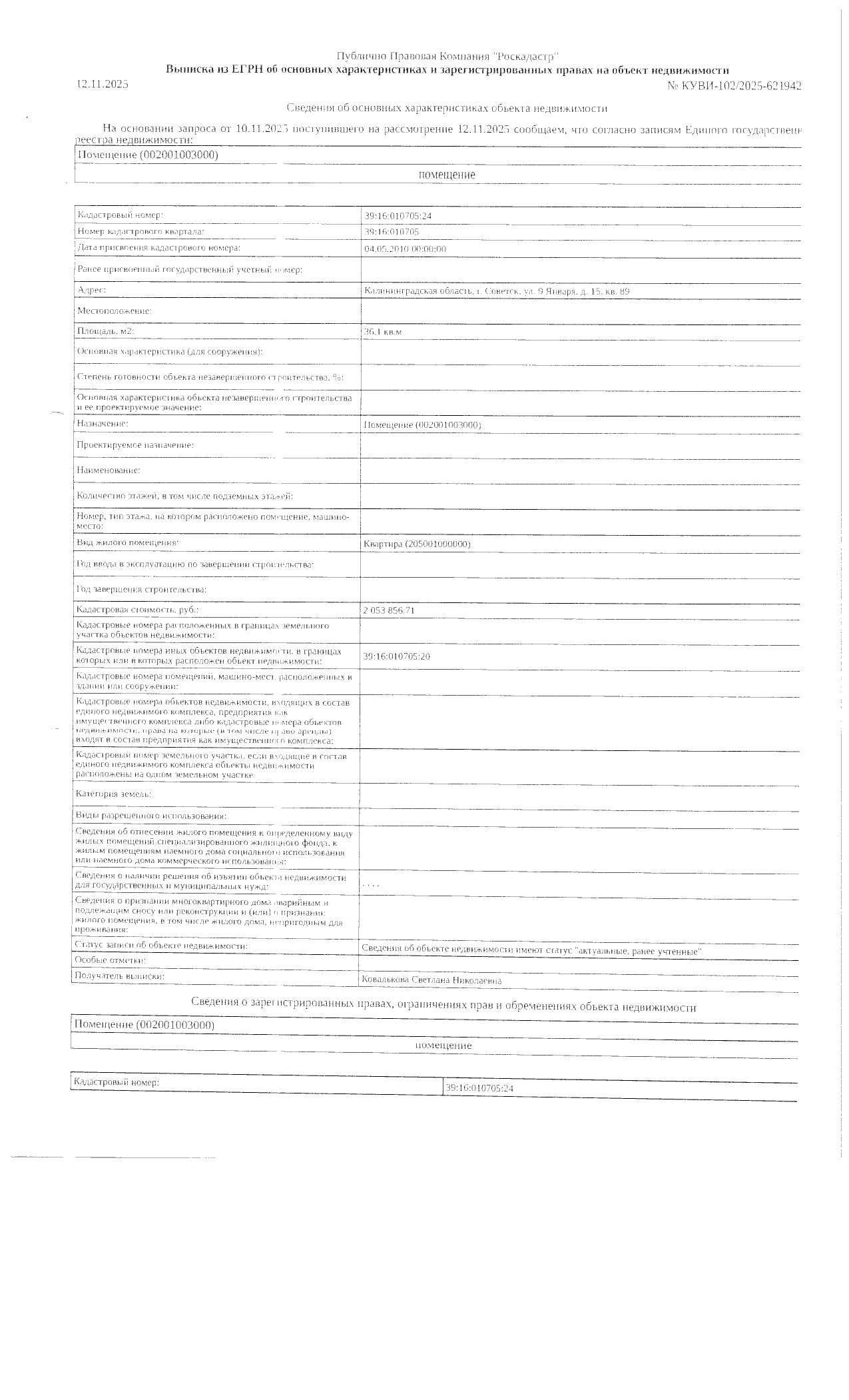 Квартира общей площадью 36,1 кв. м, кадастровый номер 39:16:010705:247