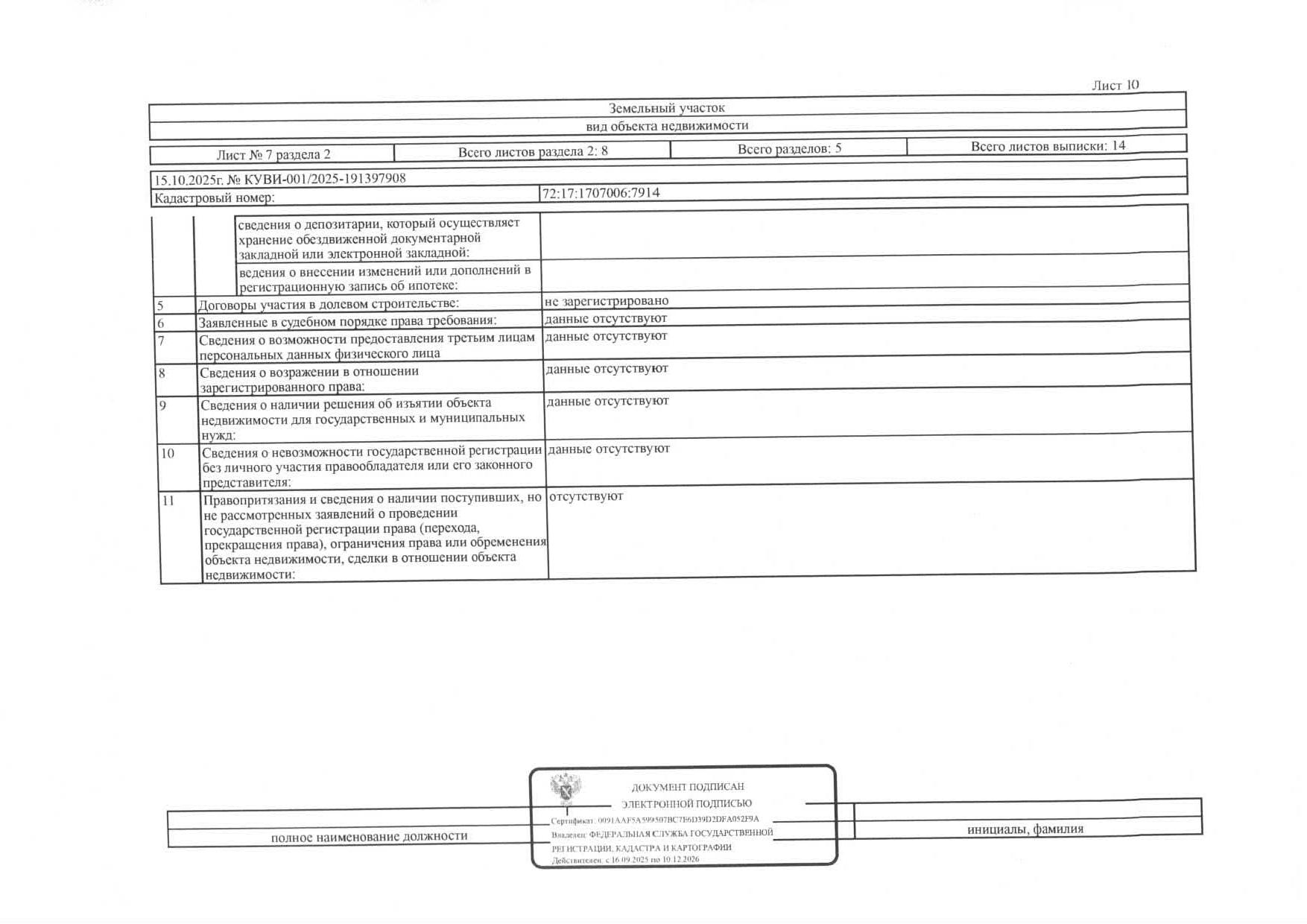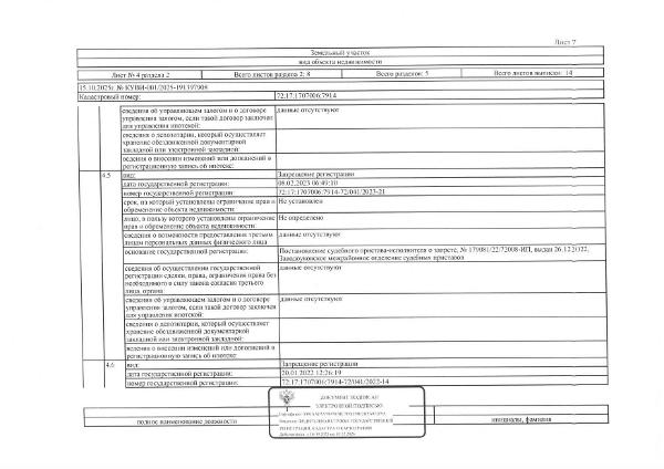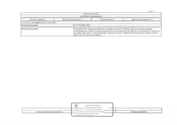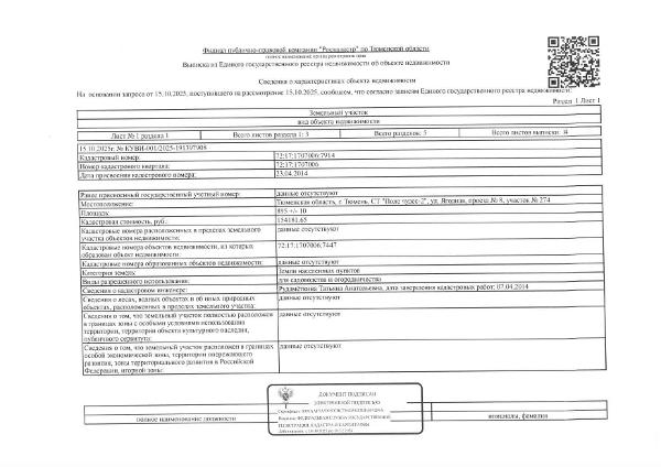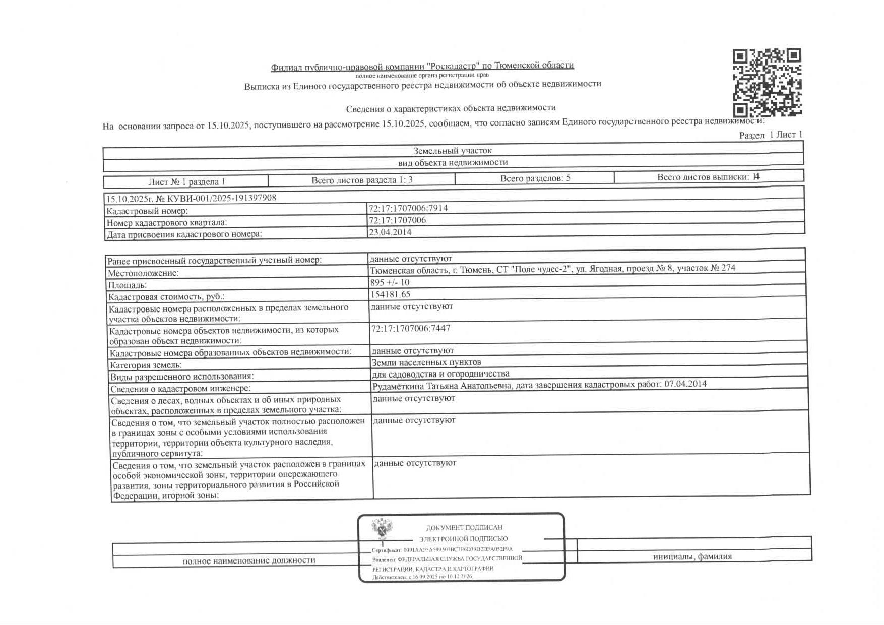 Земельный участок, площадь 895 кв.м., кадастровый номер: 72:17:1707006:7914, г. Тюмень, СНТ "Поле Чудес-2", ул. Ягодная, пр. 8, уч. 274, рег.№ 72-010442(26)