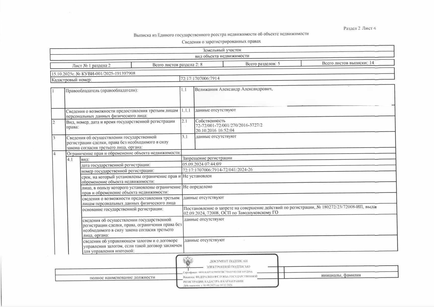 Должник: Велижанин А.А, собственник: Велижанин А.А. Лот: Земельный участок (земли населенных пунктов, для садоводства и огородничества), площадь 895 кв.м., кадастровый номер: 72:17:1707006:7914, г. Тюмень, СНТ "Поле Чудес-2", ул. Ягодная, пр. 8, уч. 274, н/ц: 705300 р., з-к: 105795 р., код: 0001, рег.№ 72-010442(26)