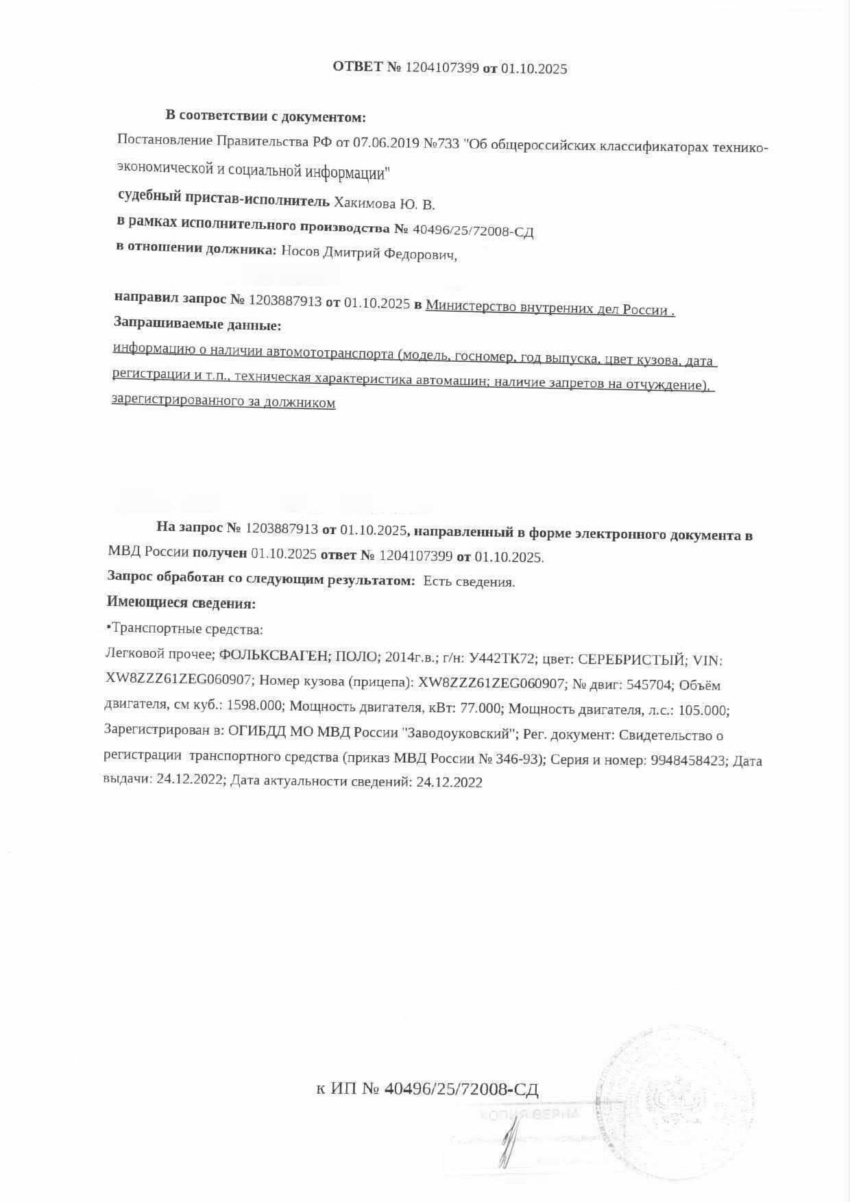 Должник: Носов Д.Ф, собственник: Носов Д.Ф. Лот: Транспортное средство легковой автомобиль Фольксваген Поло, 2014 г.в., г/н: У442ТК72, VIN XW8ZZZ61ZEG060907, МКПП, ТС после ДТП, по кузову сколы, царапины, вмятины, ржавчины, передний бампер отсутствует, г. Заводоуковск, ул. Севастопольская, д.4, н/ц: 572800 р., з-к: 85920 р., код: 0001, рег.№ 72-010443(26)