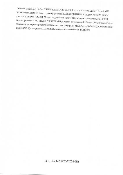 Транспортное средство, легковой универсал, LADA KS035L LADA LARGUS, 2019 г.в., г/н У290МТ72,VIN: ХТАКS035LK1186810, рег.№ 72-010297;