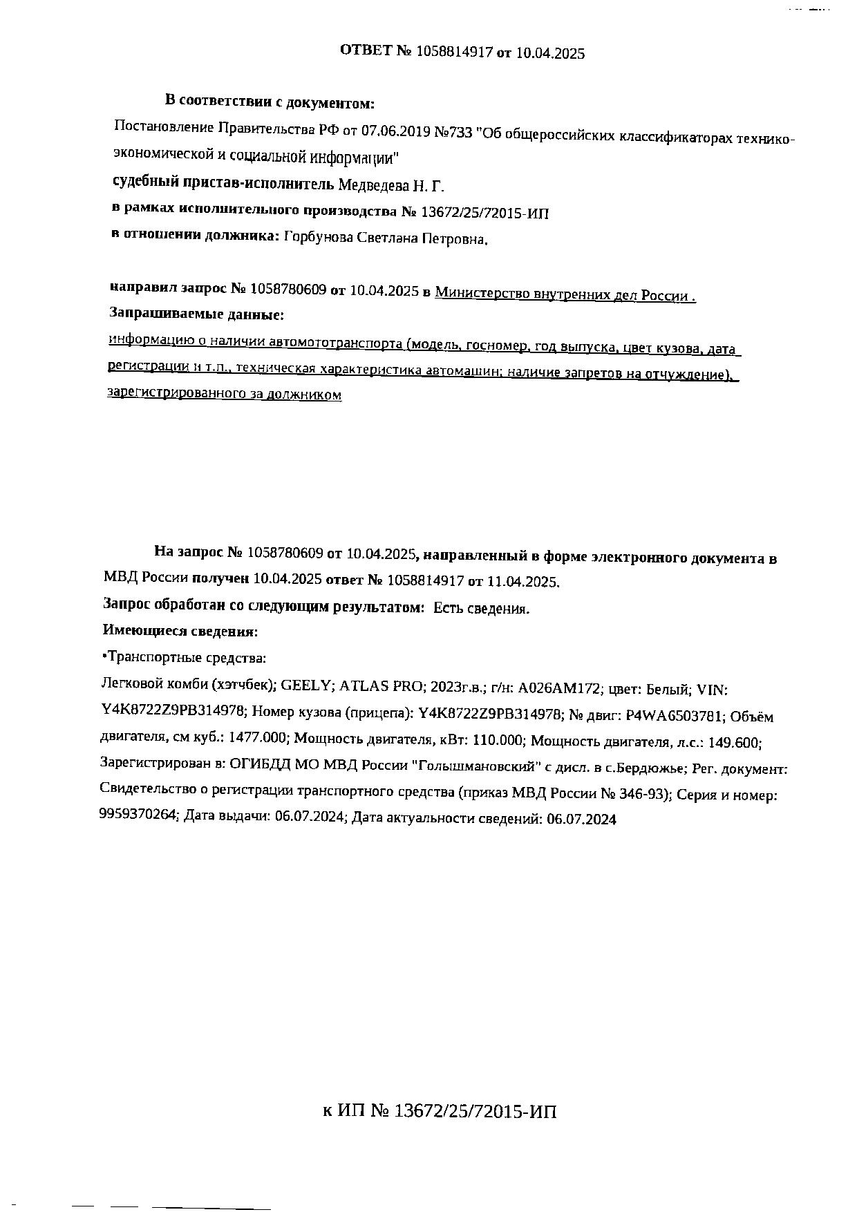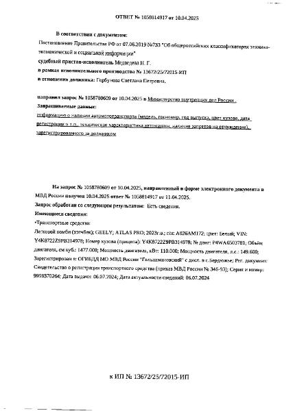Должник: Горбунова С.П., собственник: Горбунова С.П. Лот: Транспортное средство, легковой комби (хэтчбек), GEELY ATLAS PRO, 2023 г.в., г/н А026АМ172, VIN: Y4K8722Z9PB314978, цвет белый, Бердюжский район, с. Истошино, ул. Ленина, д. 73 (в залоге у третьего лица, имущество реализуется с сохранением залога при переходе прав на имущество от залогодателя - Должника к покупателю), н/ц: 1564085 р., з-к: 234613 р., код: 0001, рег.№ 72-010474;