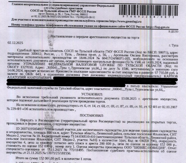 Земельный участок, категория земель: земли сельскохозяйственного назначения, виды разрешенного использования: для коллективного садоводства, площадь 800 +/- 20 кв.м., кадастровый номер 71:14:030510:410, местоположение: Тульская область, Ленинский район, сельское поселение Ильинское, садоводческое некоммерческое товарищество "Медик-2", участок №10. Особые отметки: для данного земельного участка обеспечен доступ посредством земельных участков с кадастровыми номерами: земли общего пользования. Взыскатель: УФНС по Тульской области. Начальная цена: 152 000 (Сто пятьдесят две тысячи) руб. 00 коп., без НДС. Задаток: 70 000 (Семьдесят тысяч) руб. 00 коп.; Шаг аукциона 1%: 1 520 (Одна тысяча пятьсот двадцать) руб. 00 коп.
