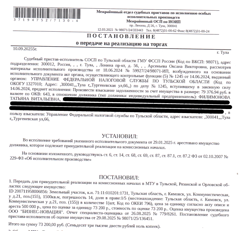 1/5 доли в праве общей долевой собственности на земельный участок, категория земель: земли населенных пунктов, виды разрешенного использования: для индивидуального жилищного строительства, площадь 1500 +/- 14 кв.м., кадастровый номер 71:11:010201:1731, адрес: обл. Тульская, г. Кимовск, у д.21 по ул.Коммунистическая, поз (155). Особые отметки: для данного земельного участка обеспечен доступ посредством земельного участка с кадастровым номером: 71:11:010201:500. Имущество принадлежит на праве общей долевой собственности Жигунову Е.М. (1/5 доля в праве), Колышкину А.В. (1/5 доля в праве), Жигуновой Л.М. (1/5 доля в праве), Жигунову М.М. (1/5 доля в праве), Филимоновой Т.В. (1/5 доля в праве). Взыскатель: УФНС по Тульской области. Начальная цена: 73 200 (Семьдесят три тысячи двести) руб. 00 коп., без НДС. Задаток: 30 000 (Тридцать тысяч) руб. 00 коп.; Шаг аукциона 1%: 732 (Семьсот тридцать два) руб. 00 коп.