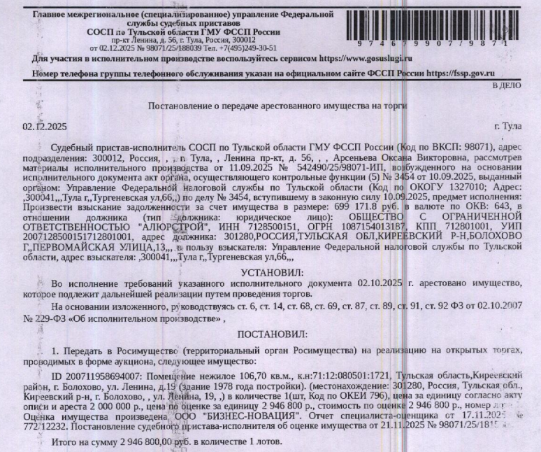 Помещение, назначение: нежилое, наименование: нежилое помещение, площадь 106,7кв.м., кадастровый номер 71:12:080501:1721, адрес: Тульская область, р-н. Киреевский, г. Болохово, ул. Ленина, д. 19, пом. Нежилое помещение. Взыскатель: УФНС по Тульской области. Начальная цена: 2 946 800 (Два миллиона девятьсот сорок шесть тысяч восемьсот) руб. 00 коп., без НДС. Задаток: 1 400 000 (Один миллион четыреста тысяч) руб. 00 коп.; Шаг аукциона 1%: 29 468 (Двадцать девять тысяч четыреста шестьдесят восемь) руб. 00 коп.