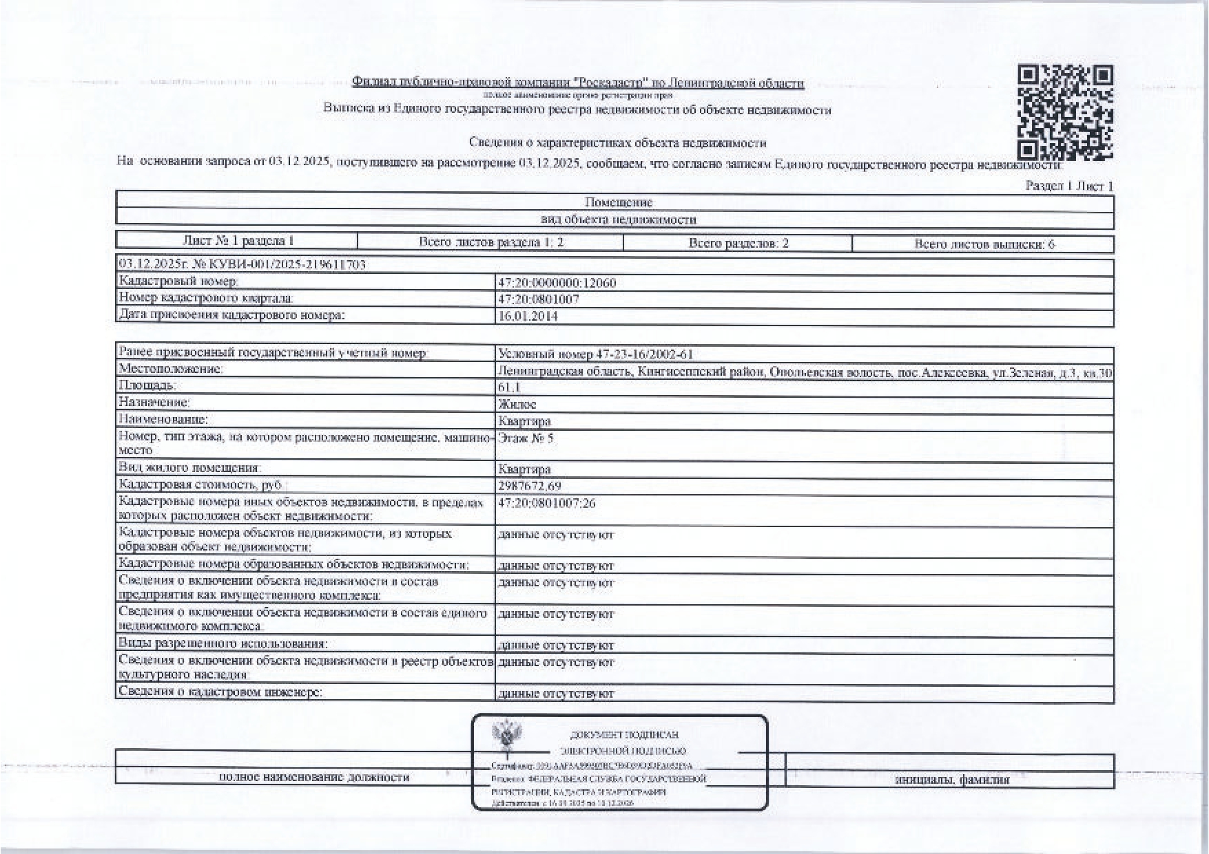 Квартира общей S 61,1 кв. м, кад. № 47:20:0000000:12060, расположенная по адресу: Ленинградская область, Кингисеппский район, Опольевская волость, пос. Алексеевка, ул. Зеленая, д. 3, кв. 30