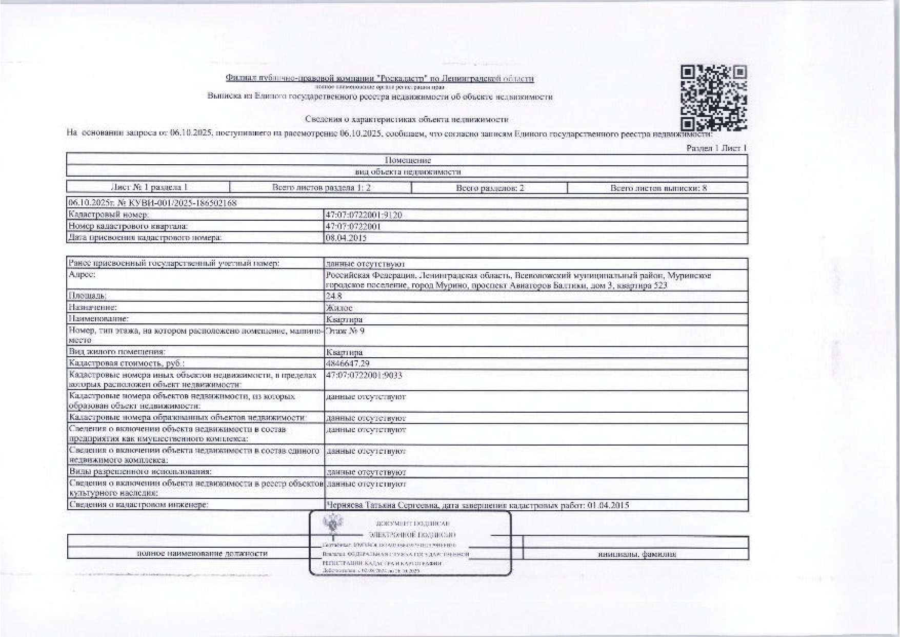 Подвергнутое аресту Всеволожским РОСП УФССП России по Ленинградской области по исполнительному производству № 521631/25/47021-ИП от 01.10.2025г. находящееся в залоге у ПАО «Сбербанк», принадлежащее должнику Макогонюк М.В. имущество: Квартира общей S 24,8 кв. м, кад. № 47:07:0722001:9120, расположенная по адресу: Ленинградская область, Всеволожский муниципальный район, Муринское городское поселение, город Мурино, проспект Авиаторов Балтики, дом 3, квартира 523. Обременения: ипотека в силу закона, запрещение регистрации. Согласно предоставленным сведениям УФССП России по Ленинградской области в квартире зарегистрированных лиц нет. Сведения о задолженности на капремонт не предоставлены
