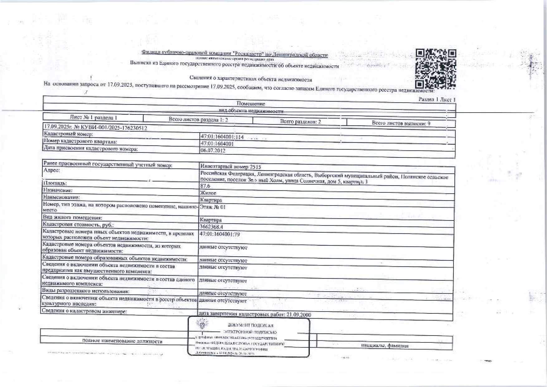 22/88 долей в квартире общей S 87,6 кв. м, кад. № 47:01:1604001:114, расположенной по адресу: Ленинградская область, Выборгский муниципальный район, Полянское сельское поселение, поселок Зеленый Холм, улица Солнечная, дом 5, квартира 3