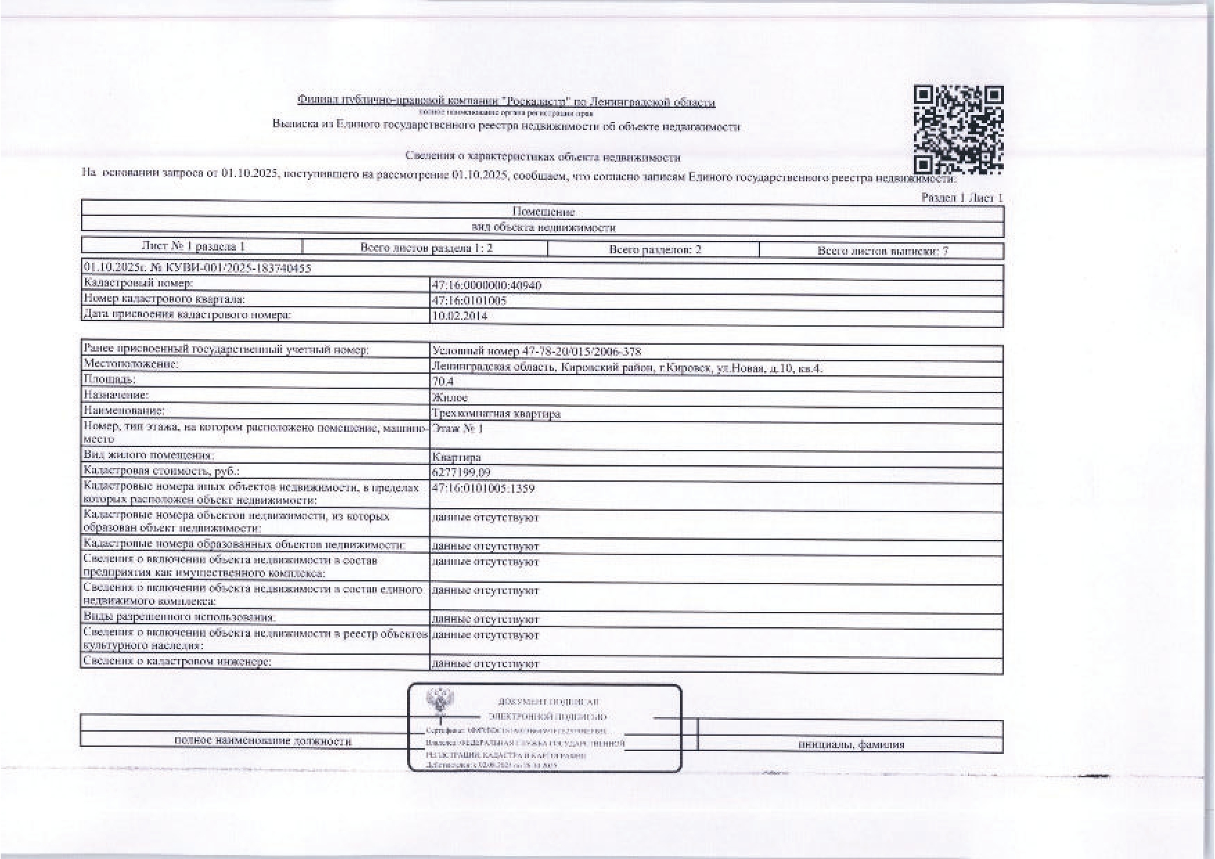 1/2 доли в квартире общей S 70,4 кв. м, кад. № 47:16:0000000:40940, расположенной по адресу: Ленинградская область, Кировский район, г. Кировск, ул. Новая, д. 10, кв. 4