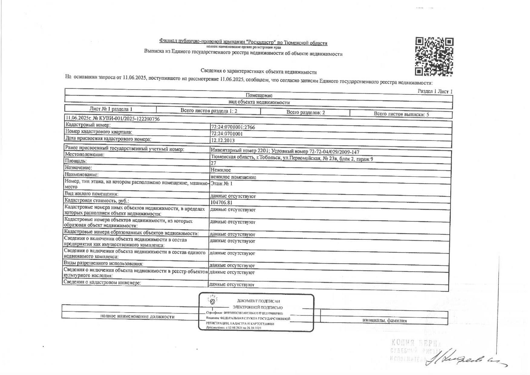 Нежилое помещение (гараж), площадь 27 кв.м., кадастровый номер: 72:24:0701001:2766, г. Тобольск, ул. Первомайская, д.23В, блок 2, гараж 9, рег.№ 72-0105-13;