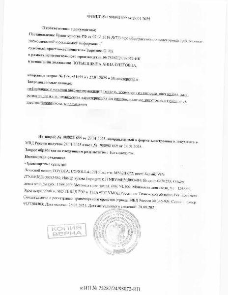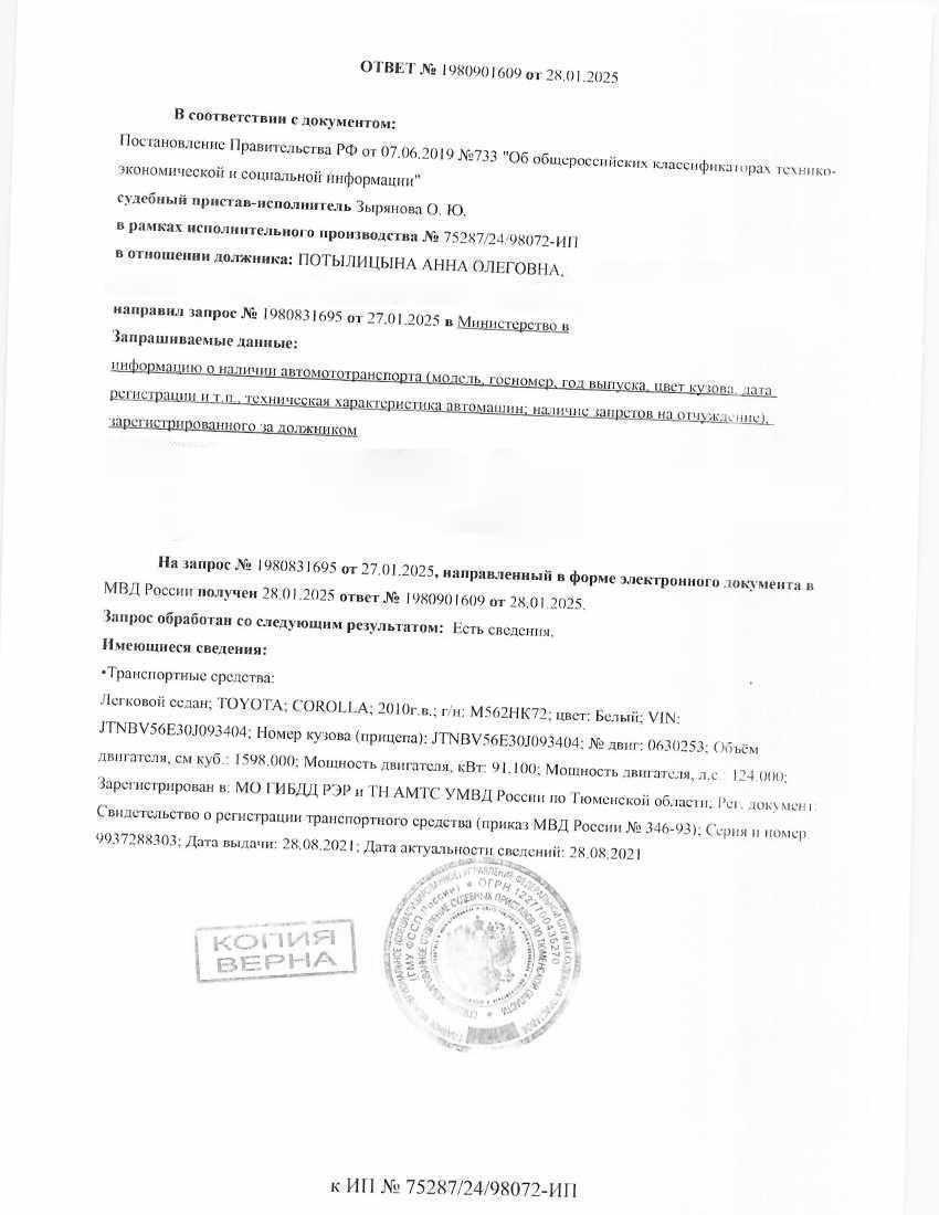 Должник: Потылицына А.О. собственник: Потылицына А.О. Лот: Транспортное средство легковой седан TOYOTA COROLLA, 2010 г.в., г/н: М562НК72, VIN JTNBV56E30J093404, пробег 175000 км., г. Тюмень, ул. Депутатская, д.80, н/ц: 823650 р., з-к: 123547 р., рег.№ 72-0105-01-ГМУ;