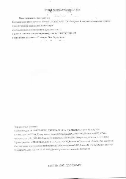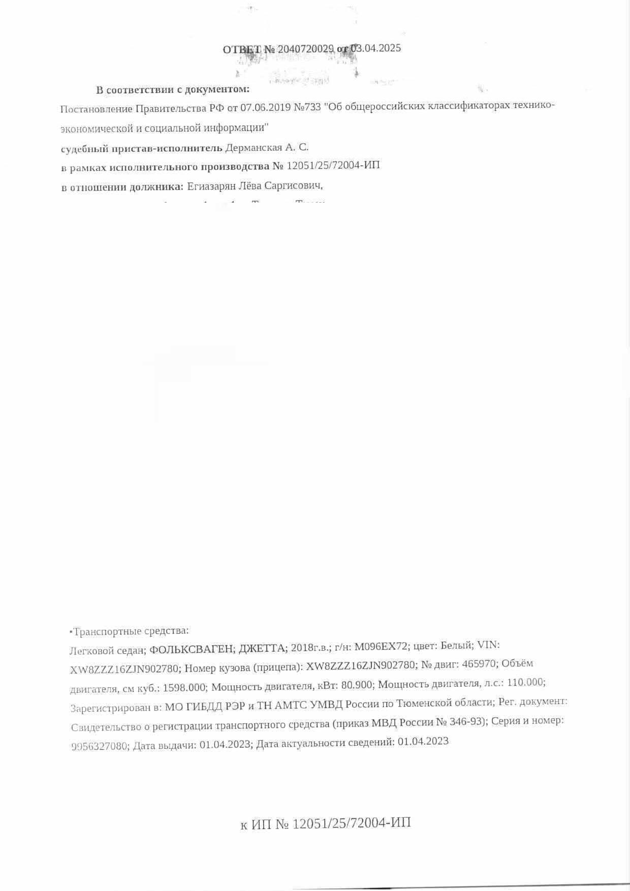 Должник: Егиазарян Л.С., собственник: Егиазарян Л.С. Лот: Транспортное средство легковой седан ФОЛЬКСВАГЕН ДЖЕТТА, 2018 г.в., г/н М096ЕХ72, VIN XW8ZZZ16ZJN902780, цвет белый г. Тюмень, ул. Тополиная, д.4, н/ц:1274700 р., з-к: 191205 р., код: 0001, рег.№ 72-010726(26);