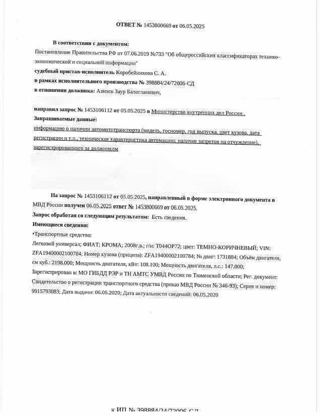 Должник: Азизов З.Б., собственник: Азизов З.Б. Лот: Транспортное средство, легковой универсал, ФИАТ КРОМА, 2008 г.в., г/н Т044ОР72, VIN: ZFA19400002100784, цвет темно-коричневый (отсутствует передний бампер, решетка радиатора, 2 передние фары, спущены 4 колеса, на переднем и заднем крыле с левой стороны множественные повреждения ЛКП, видимые следы коррозии, дверь со стороны водителя красного цвета, повреждения ЛКП, задняя левая следы коррозии, отсутствуют обе задние фары, бампер крыла с правой стороны поврежден, 2 двери с правой стороны повреждены, ключи и документы отсутствуют) г. Тюмень, ул. Старотобольский тракт, д.155, н/ц: 231965 р., з-к: 34795 р., код: 0001, рег.№ 72-010556;