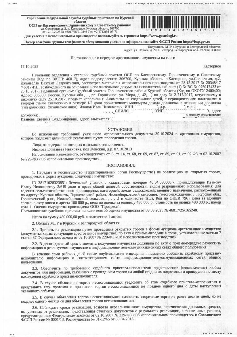 2/619 доли в праве общей долевой собственности на земельный участок общей площадью 12132400 кв. м, кадастровый номер 46:04:080000:7 (единое землепользование), категория земель: земли сельскохозяйственного назначения, вид разрешенного использования: для ведения сельскохозяйственного производства (имущество обременено: арест; запрет на совершение регистрационных действий; ограничения прав на земельный участок, предусмотренные статьей 56 Земельного кодекса Российской Федерации; аренда в пользу ООО «Восход», срок действия с 11.12.2006 по 30.01.2055) Имущество принадлежит на праве общей долевой собственности должнику Иванову И.Н. (2/619 доли). Взыскатель – Иванова Е.В. Основание проведения аукциона: постановление о передаче арестованного имущества на торги от 17.10.2025 №46017/25/219846 судебного пристава - исполнителя ОСП по Касторенскому, Горшеченскому и Советскому районам; решение именем РФ Горшеченского района Курской области от 02.04.2024 дело № 2-63/2024