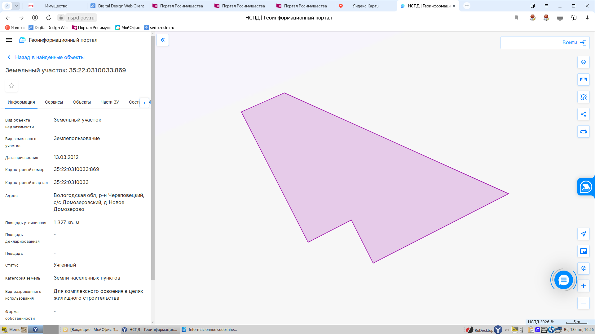 Земельный участок, площадью 1327 кв.м., кадастровый номер 35:22:0310033:869, расположенный по адресу: Вологодская область, Череповецкий район, с/с Домозеровский, д. Новое Домозерово 1 Штука (шт)