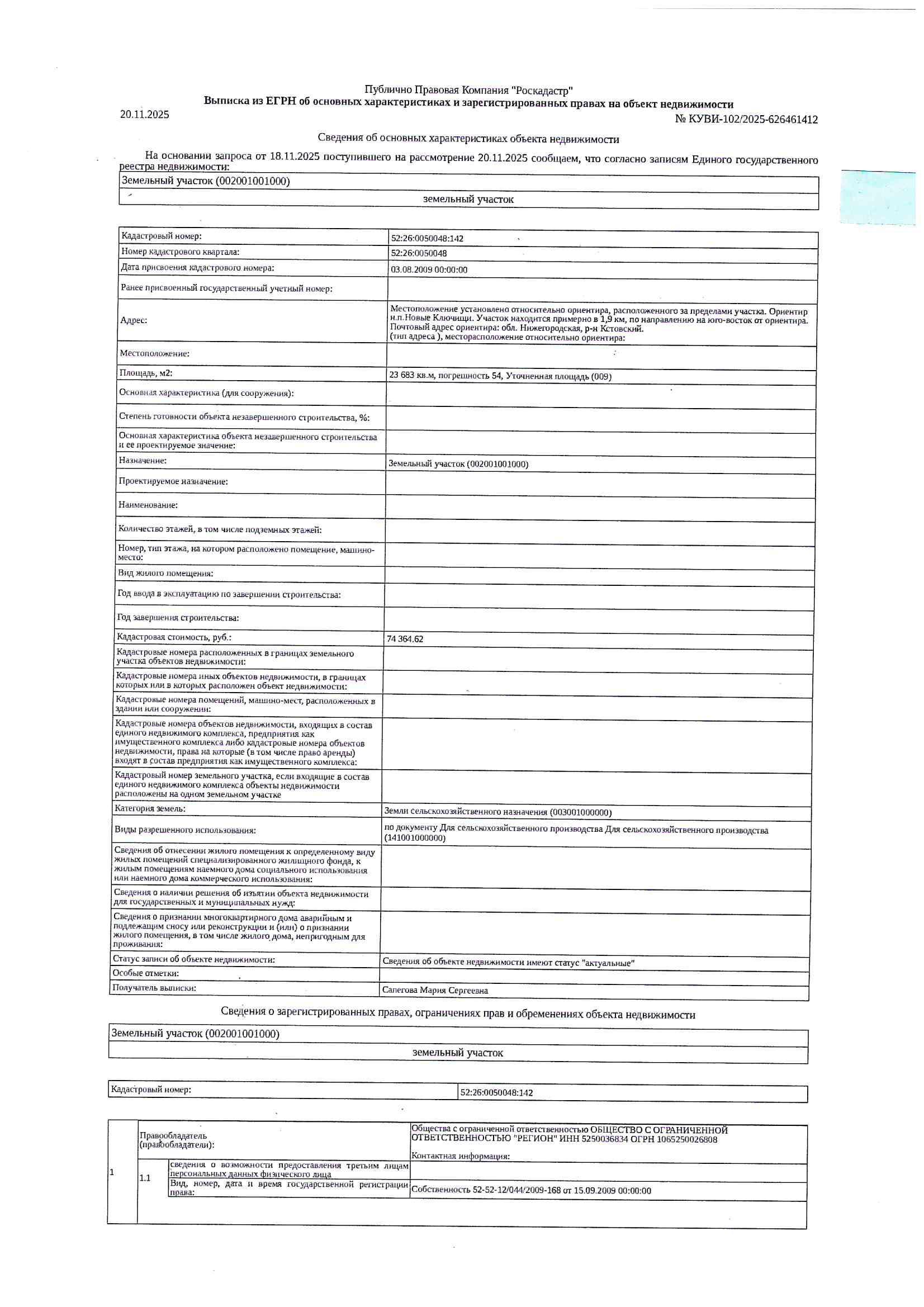 Земельный участок площадью 23683 +/- 54 кв. м, кадастровый (или условный) номер 52:26:0050048:142, категория земель - земли сельскохозяйственного назначения, вид разрешенного использования - для сельскохозяйственного производства. Местоположение установлено относительно ориентира, расположенного за пределами участка. Ориентир - нп. Новые Ключищи. Участок находится примерно в 1,9 км, по направлению на юго-восток от ориентира. Почтовый адрес ориентира: Нижегородская обл., Кстовский р-н