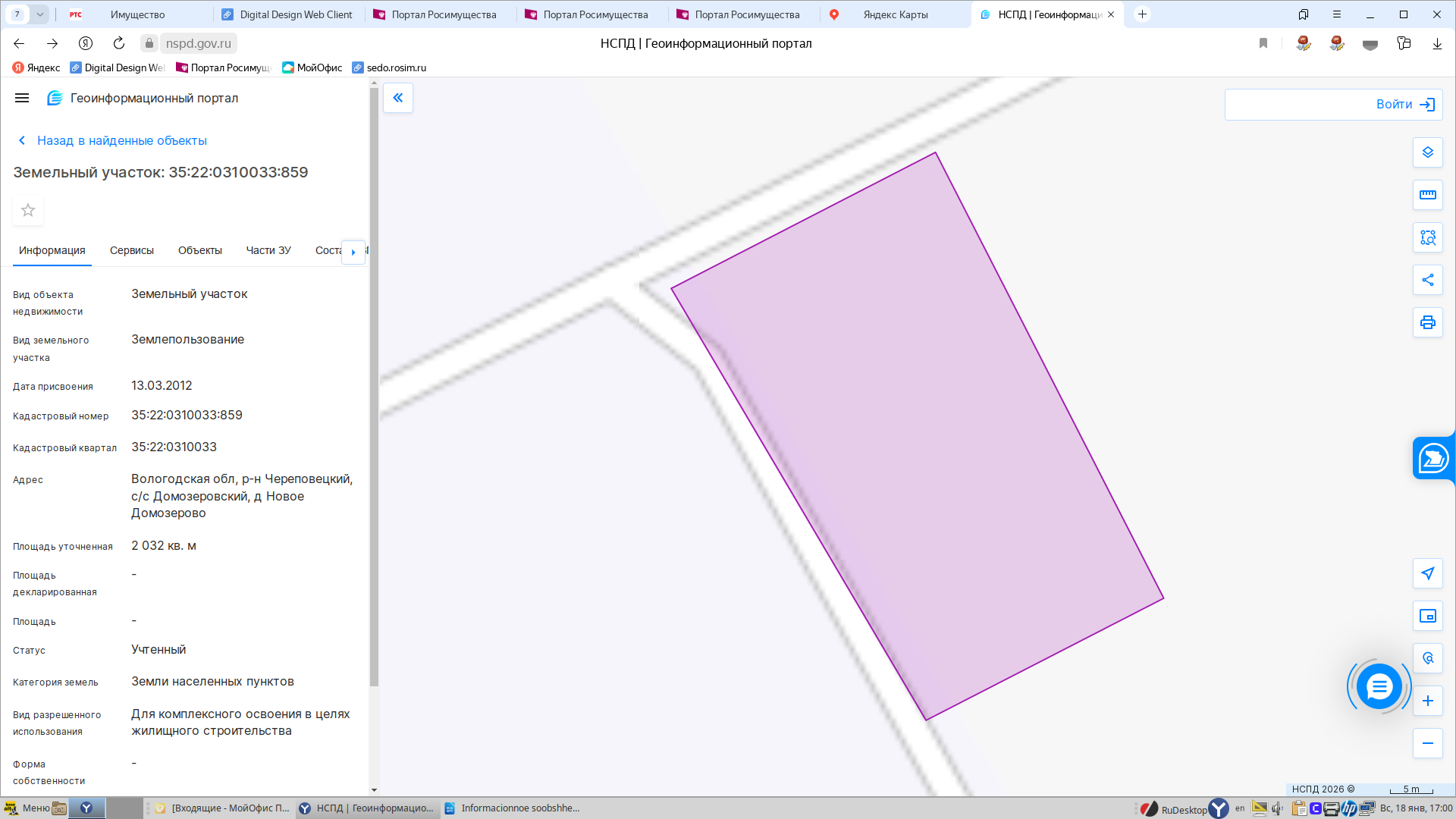 Земельный участок, площадью 2032 кв.м., кадастровый номер 35:22:030033:859, расположенный по адресу: Вологодская область, Череповецкий район, с/с Домозеровский, д. Новое Домозерово 1 Штука (шт)