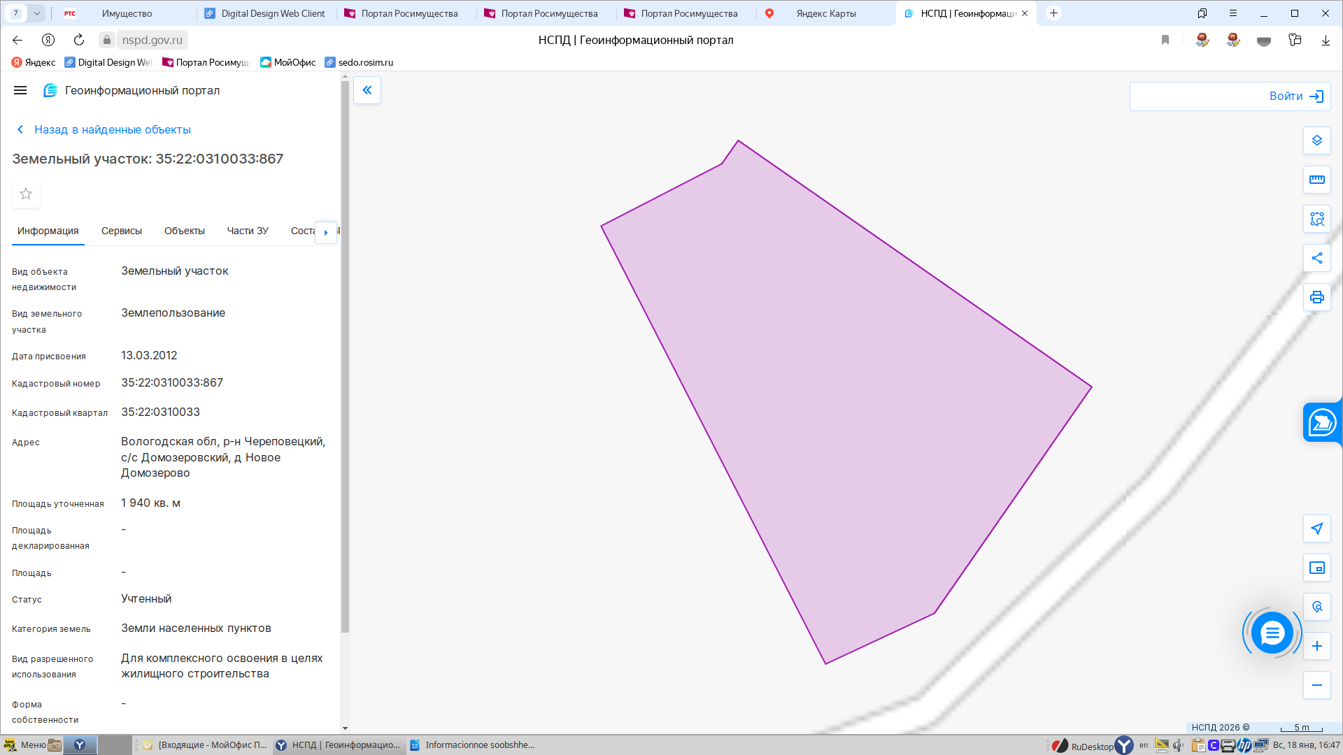 Земельный участок, площадью 1940 кв.м., кадастровый номер 35:22:0310033:867, расположенный по адресу: Вологодская область, Череповецкий район, с/с Домозеровский, д. Новое Домозерово 1 Штука (шт)
