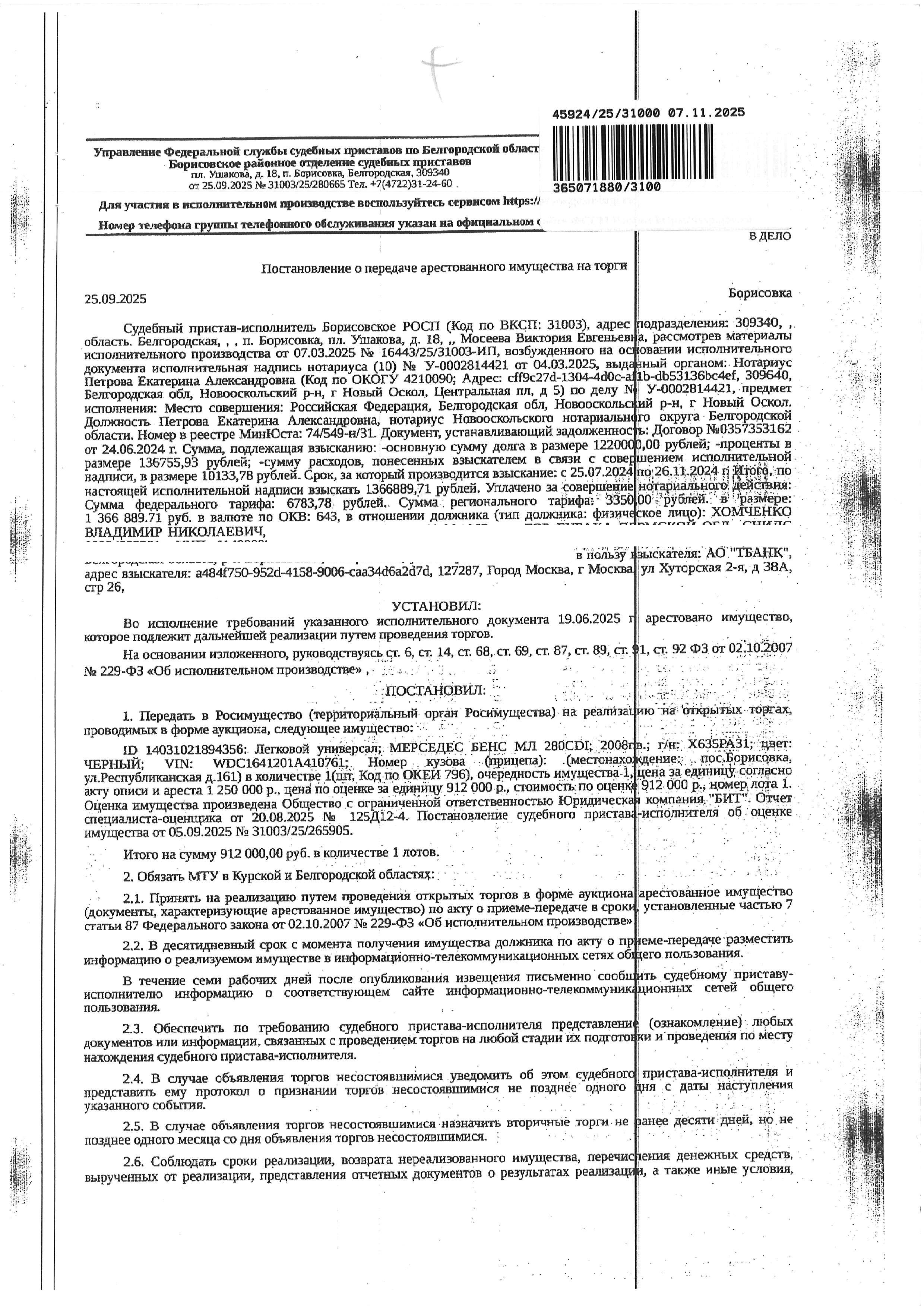 Автомобиль легковой универсал МЕРСЕДЕС БЕНС МЛ 280CDI, 2008 года выпуска, государственный номер Х635РА31, идентификационный номер (VIN) WDC1641201A410761, номер кузова (кабины) WDC1641201A41076, цвет кузова (кабины) ЧЕРНЫЙ, рабочий объем (см³) 2987, мощность (кВт/л.с.) 139/190. Наличие повреждений: внешние повреждения отсутствуют. Имущество обременено: арест, залог (АО «ТБанк»), запрещение регистрации. Взыскатель: АО «ТБанк». Имущество принадлежит на праве собственности Хомченко В.Н. Основание реализации: исполнительная надпись нотариуса № У-0002814421 от 04.03.2025
