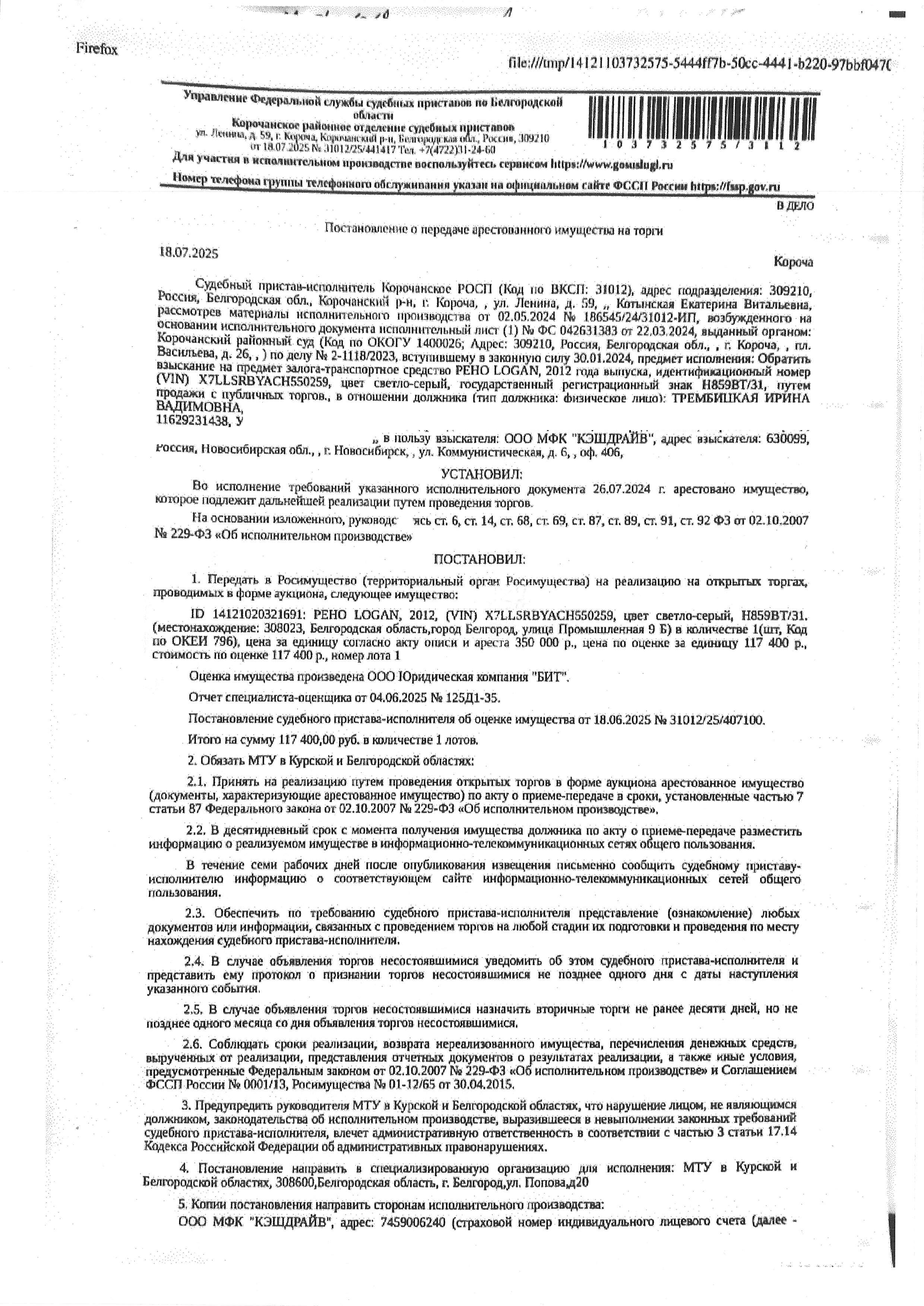 Автомобиль легковой Рено Логан, 2012 года выпуска, государственный номер Н859ВТ31, идентификационный номер (VIN) X7LLSRBYACH550259, номер кузова (кабины) X7LLSRBYACH550259, цвет кузова (кабины): светло-серый, рабочий объем (см³) 1598, мощность (кВт/л.с.) 76/103.0. Наличие повреждений: трещина на лобовом стекле, осколочные повреждения по кузову, левая передняя дверь, задняя левая дверь и капот вмятина, повреждение лакокрасочного покрытия. Имущество обременено: арест, запрещение регистрации, залог (ООО МФК «Кэшдрайв»). Взыскатель: ООО МФК «Кэшдрайв». Имущество принадлежит на праве собственности Трембицкой И.В. Основание реализации: исполнительный лист Корочанского районного суда Белгородской области серия ФС № 042631383 от 29.12.2023