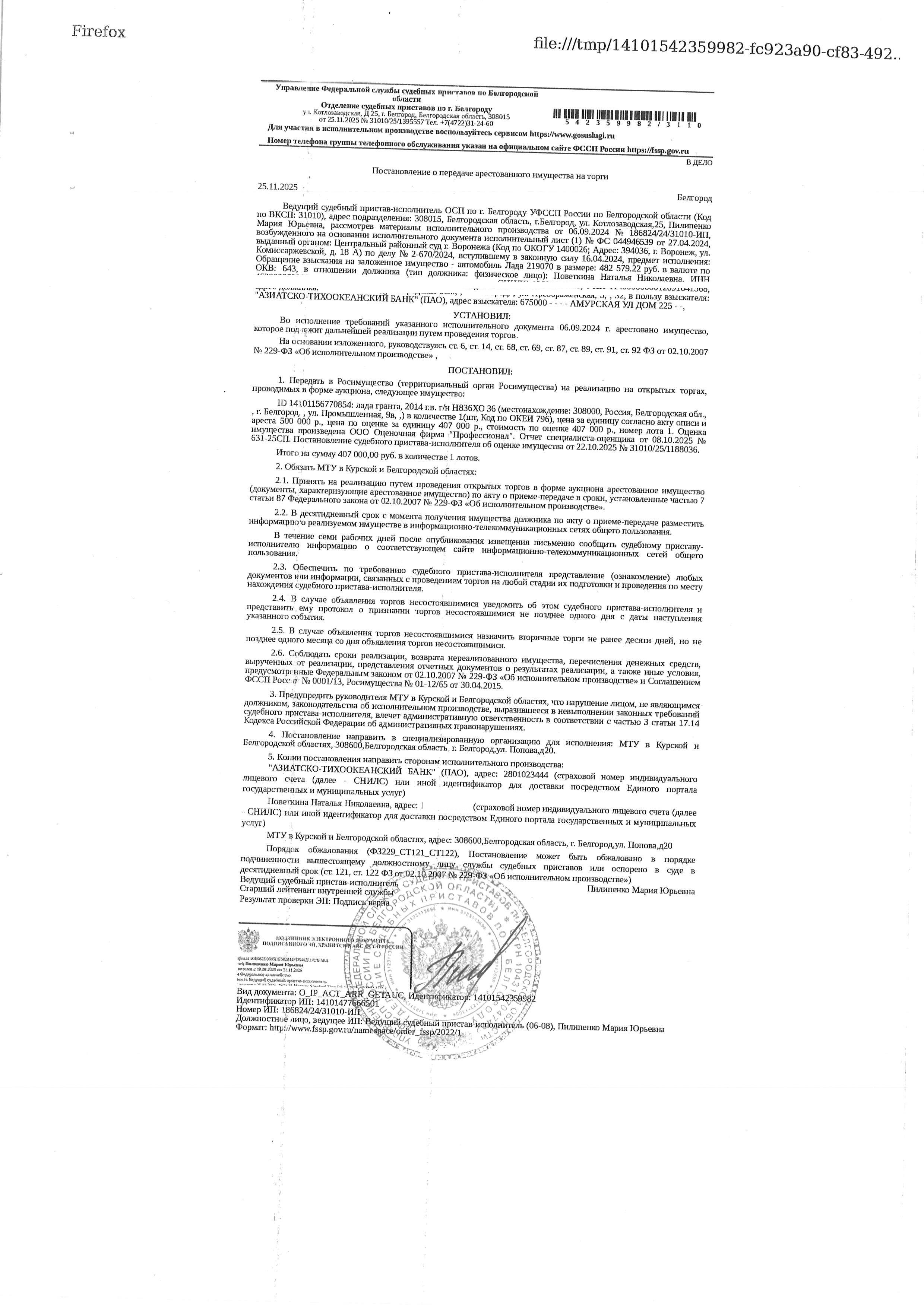 Автомобиль легковой LADA GRANTA, 2014 года выпуска, государственный номер Н836ХО36, идентификационный номер (VIN) XTA219070E0263615, цвет кузова (кабины): серебристый, номер кузова (кабины) XTA219070E0263615, рабочий объем (см³) 1596, мощность (кВт/л.с.) 78.000/106.100. Наличие повреждений: коррозия по кузову. Имущество обременено: залог (АО «Азиатско-Тихоокеанский Банк»), арест, запрещение регистрации. Взыскатель: АО «Азиатско-Тихоокеанский Банк». Имущество принадлежит на праве собственности Поветкиной Н.Н. Основание реализации: Исполнительный лист Центрального районного суда г. Воронежа серия ФС номер 044946539 от 12.02.2024