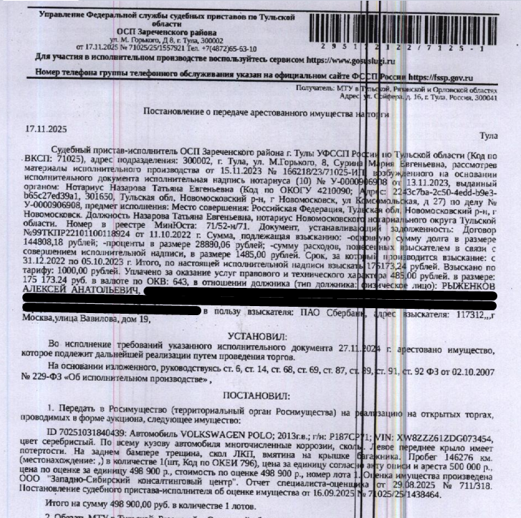 Легковой автомобиль VОLКSWАGЕN РОLО, 2013 г.в., гос.номер Р187СР71, VIN XW8ZZZ61ZDG073454, цвет серебристый, по всему кузову многочисленные коррозии, сколы, левое переднее крыло имеет потертости, на заднем бампере трещина, скол ЛКП, вмятина на крыше багажника, пробег 146276 км. Место хранения: г. Тула, ул. Герцена, д. 7. Ответственный хранитель Рыженков А.А. Согласно реестру уведомлений о залоге имущество находится в залоге у ПАО «Совкомбанк». Взыскатель: ПАО «Сбербанк».
