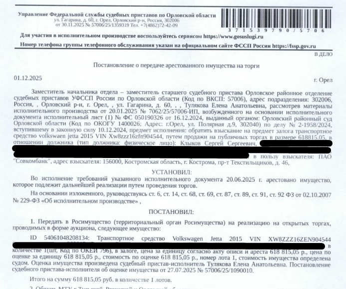 Легковой автомобиль ФОЛЬКСВАГЕН ДЖЕТТА, 2015 г.в., гос.номер Е099АТ57, VIN XW8ZZZ16ZFN904544. Место хранения: Орловская обл., д. Некрасовка, пер. Школьный, д. 54. Ответственный хранитель Клыков С.С. Залогодержатель: ПАО «Совкомбанк». Начальная цена 618 815 (Шестьсот восемнадцать тысяч восемьсот пятнадцать) руб. 05 коп., без НДС, сумма задатка 300 000 (Триста тысяч) руб. 00 коп. Шаг аукциона 1%: 6 188 (Шесть тысяч сто восемьдесят восемь) руб. 15 коп.