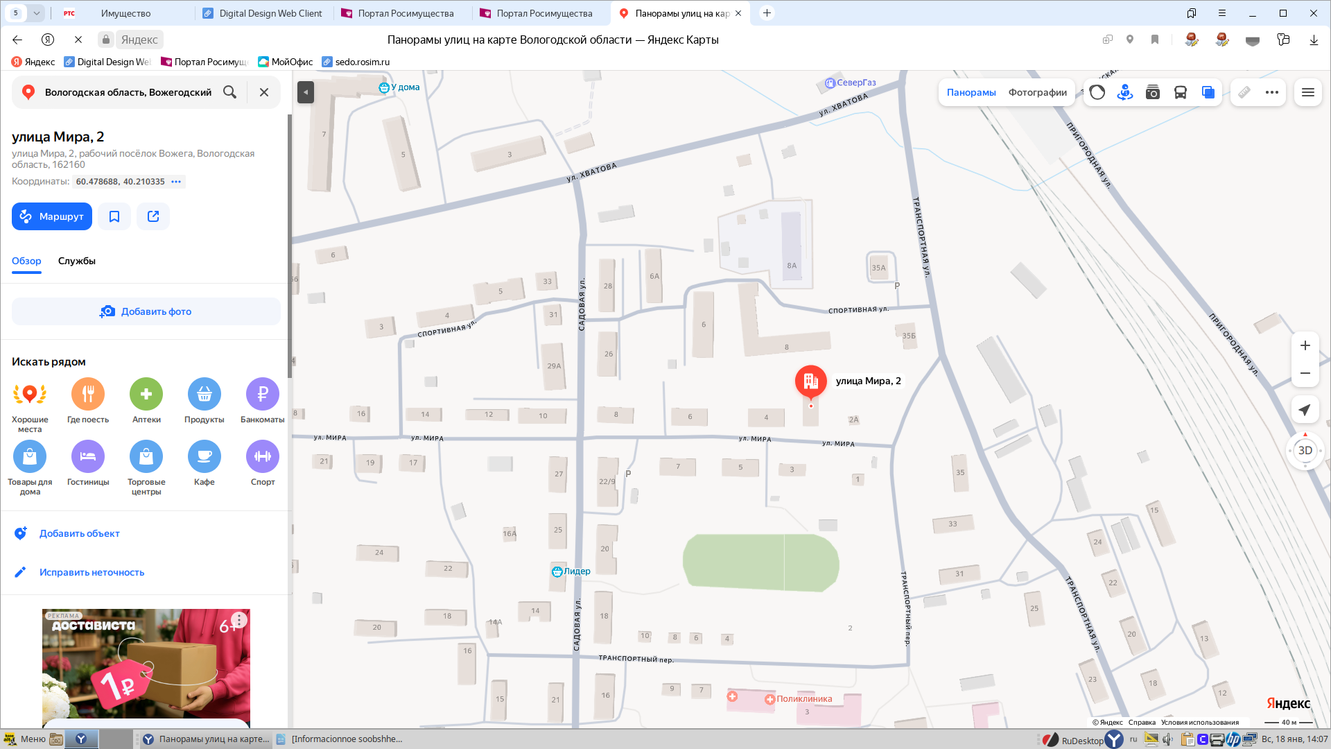 1/4 доля жилого помещения (квартира), площадью 43,8 кв.м., кадастровый номер 35:06:0101003:253, расположенная по адресу: Вологодская область, Вожегодский район, п. Вожега, ул. Мира, д.2,кв.7 1 Штука (шт)