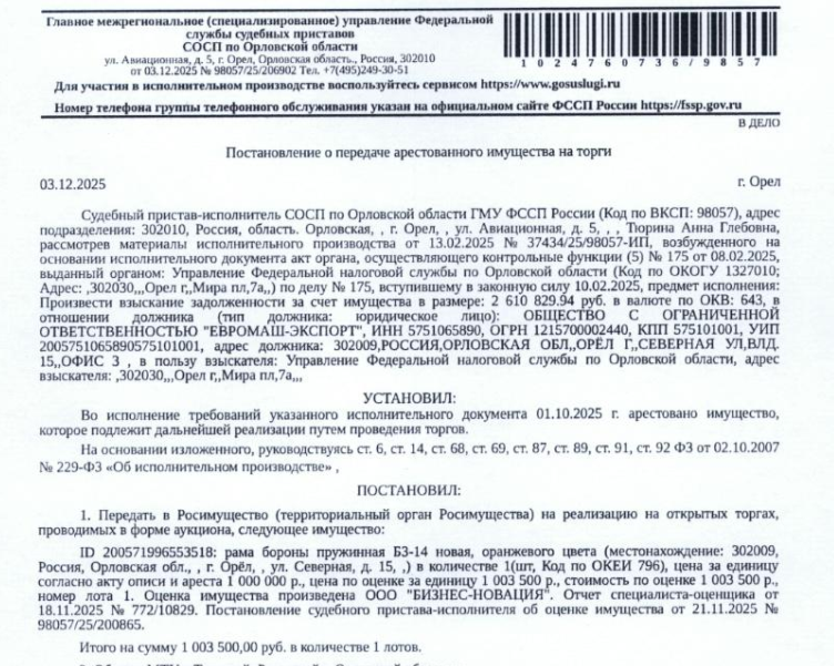 Рама бороны пружинная БЗ-14 новая, оранжевого цвета. Место хранения: г. Орел, ул. Северная, д. 15, оф. 3. Ответственный хранитель Авдеев Я.В. Взыскатель: УФНС по Орловской области. Начальная цена 1 003 500 (Один миллион три тысячи пятьсот) руб. 00 коп., без НДС, сумма задатка 450 000 (Четыреста пятьдесят тысяч) руб. 00 коп. Шаг аукциона 1%: 10 035 (Десять тысяч тридцать пять) руб. 00 коп.