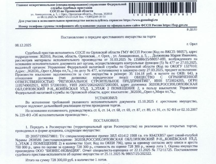 Транспортное средство специализированное прочее ЗИЛ 431412, 1988 г.в. г/н К642ХВ57. цвет синий-голубой, № шасси (рамы) 2838586. Место хранения: Орловская обл., Орловский р-н, ул. Конёвская, 3. Ответственный хранитель Белов О.А. Взыскатель: УФНС по Орловской области. Начальная цена 728 300 (Семьсот двадцать восемь тысяч триста) руб. 00 коп., без НДС, сумма задатка 350 000 (Триста пятьдесят тысяч) руб. 00 коп. Шаг аукциона 1%: 7 283 (Семь тысяч двести восемьдесят три) руб. 00 коп.