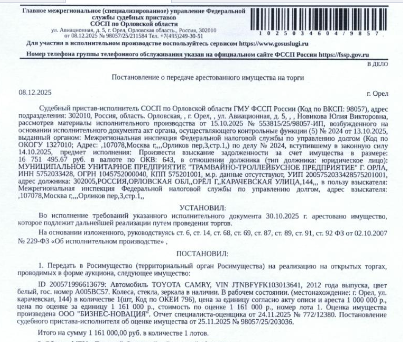 Автомобиль ТОЙОТА САМRУ, VIN JTNBFYFK103013641, 2012 г.в., гос. номер А005ВС57, цвет белый, колеса, стекла, зеркала в наличии, в рабочем состоянии. Место хранения: г Орел, ул. Карачевская д 144. Ответственный хранитель Косолапов И.Н. Взыскатель: МИФНС по управлению долгом. Начальная цена 1 161 000 (Один миллион сто шестьдесят одна тысяча) руб. 00 коп., без НДС, сумма задатка 570 000 (Пятьсот семьдесят тысяч) руб. 00 коп. Шаг аукциона 1%: 11 610 (Одиннадцать тысяч шестьсот десять) руб. 00 коп.
