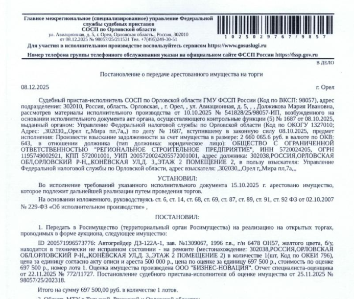 Автогрейдер ДЗ-122А-1, зав. №1309067, 1996 г.в., г/н 6478 ОН 57, желтого цвета, б/у, находится в технически не исправном состоянии - на ремонте. Место хранения: г. Орел, пер. Силикатный, д. 4. Ответственный хранитель Белов О.А. Согласно реестру уведомлений о залоге имущество находится в залоге у ФНС. Реализация имущества должника не лишает права залогодержателя на обращение взыскания на предмет залога. Взыскатель: УФНС по Орловской области.