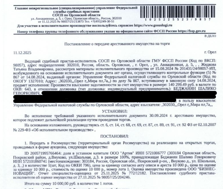 Доля в уставном капитале ООО «Артив», ИНН 5721006777, ОГРН 1205700001220 (адрес: 303184, Орловская область, р-н Покровский, д. Внуково, ул. Школьная, рядом с д. 3) в размере 100%, номинальная стоимость доли 10 000,00 руб. Взыскатель: УФНС по Орловской области.