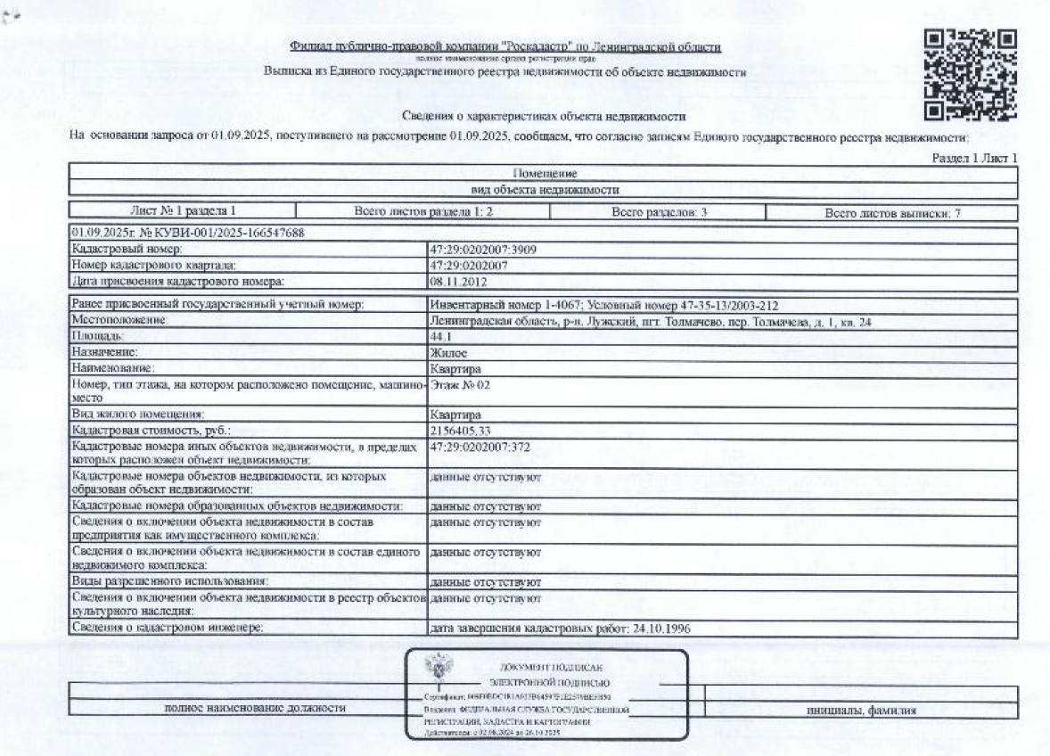 Лот№2(повторные) Подвергнутое аресту СОСП ГМУ по и/п 58886/24/98047-ИП и принадлежащее должнику Легаевой Н.Ю. арестованное имущество: ½ доли в квартире общ.пл. 44,1 кв.м. кадастровый № 47:29:0202007:3909, расположенная по адресу: ЛО, Лужский район, пгт. Толмачево, пер. Толмачева, д.1, кв. 24. Форма №7, Форма №9 судебным приставом-исполнителем не представлены. Сведения о задолженности по взносам на капитальный ремонт судебным приставом-исполнителем не представлены.