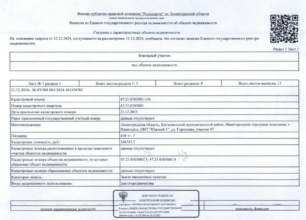 земельный участок общ.пл. 430 кв.м. кадастровый № 47:21:0305001:136, расположенный по адресу: ЛО, Кингисеппский район, г. Ивангород, , ОНТ «Южный-1», ул. Гороховая, уч. 97.