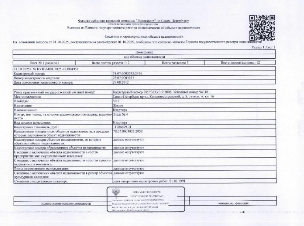 Лот№9 Подвергнутое аресту Всеволожского РОСП по и/п 374055/25/47021-ИП и принадлежащее должнику Павлову Д.В. арестованное имущество: ¾ долей в квартире общ.пл. 50,7 кв.м. кадастровый № 78:07:0003033:2416, расположенная по адресу: СПБ, пр. Каменноостровский, д.8, лит А, кв. 16. Форма №7, Форма №9 судебным приставом-исполнителем не представлены. Сведения о задолженности по взносам на капитальный ремонт судебным приставом-исполнителем не представлены.